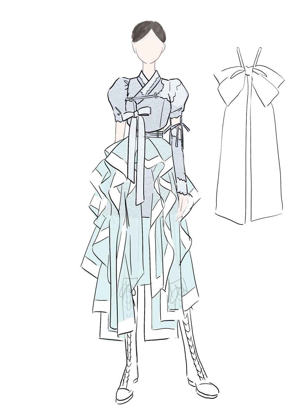サイドバックルやスポーティなナイロンの紐で編んだ水引ベルトを取り入れることで、清楚な中にもアクティブな雰囲気を感じられるデザインにしました。 また、甲冑から着想を得たバングルやロングブーツで、戦闘感も表現いたしました。