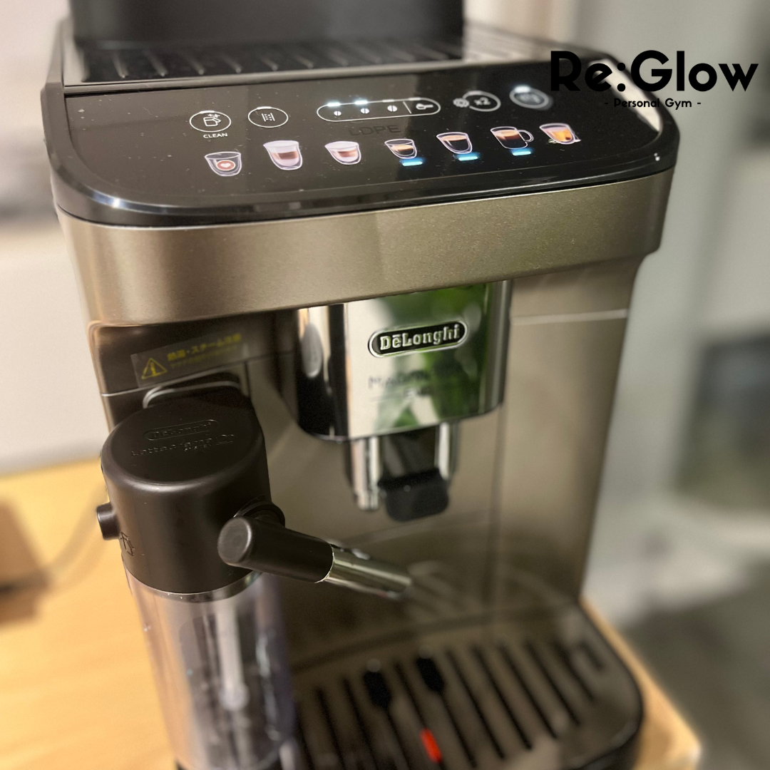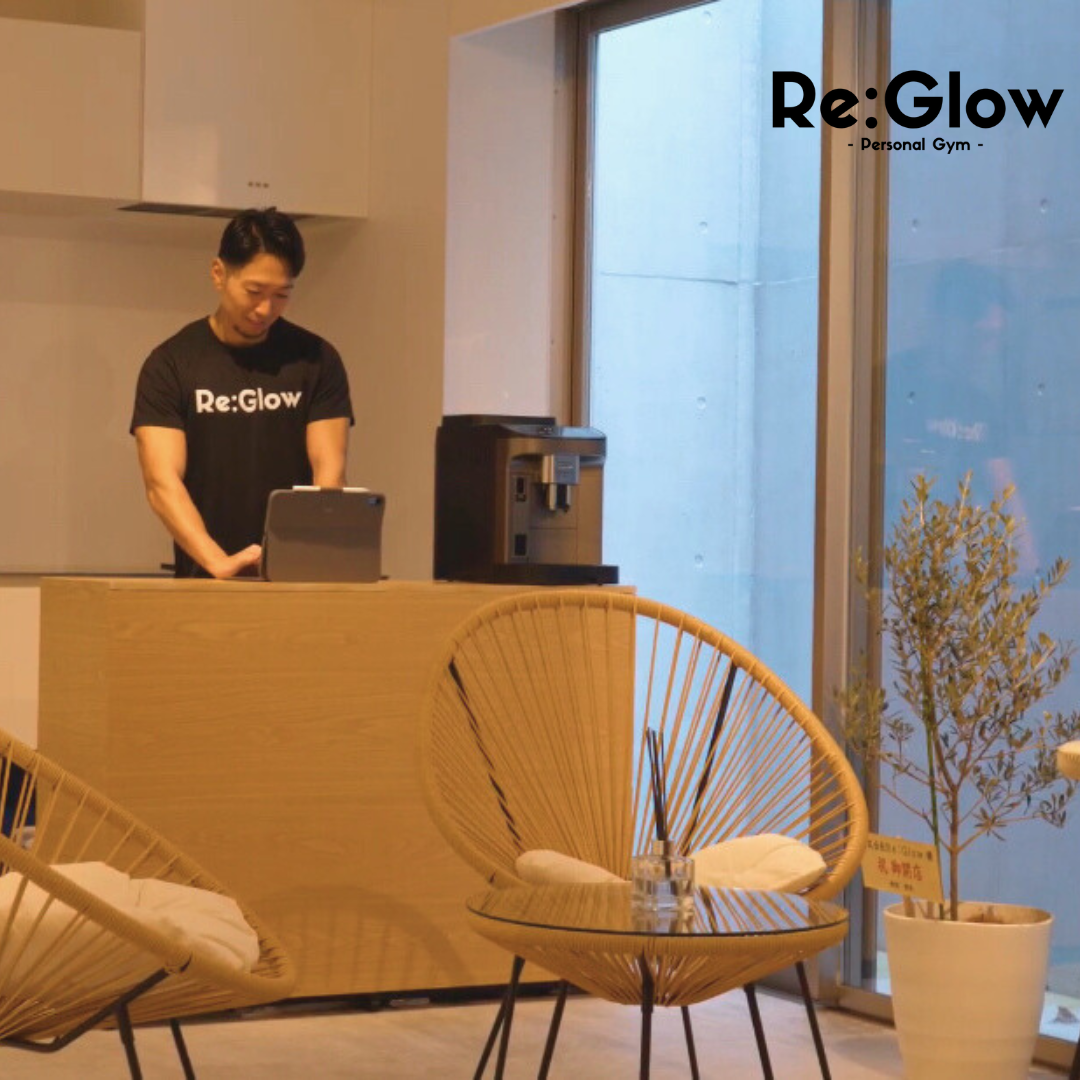 カフェのような洗練された空間を提供するRe:Glowパーソナルジム。一般的なジムとは違いコーヒーマシンやおしゃれな椅子などがありリラックスできる空間を提供。先着制で入会金¥22,000⇨¥0!!