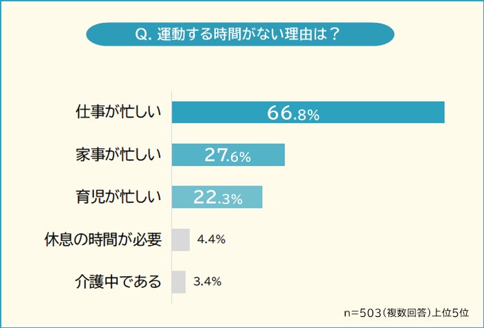 「運動する時間がない理由」を聞いたところ、圧倒的1位は「仕事が忙しい(66.8%)」で全体の7割近くを占めました。2位「家事が忙しい(27.6%)」、3位「育児が忙しい(22.3%)」も多くの票を集めています。