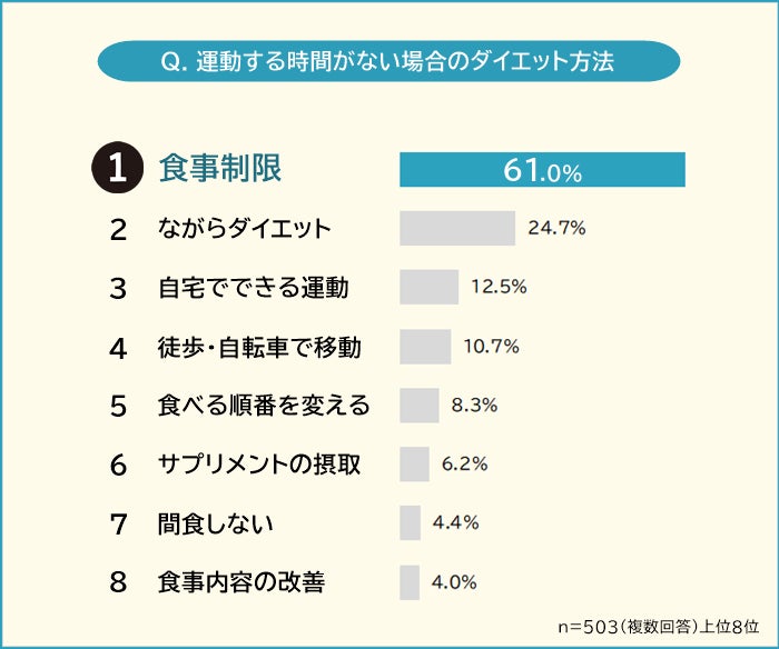 ダイエット経験がある503人に聞いた、運動する時間がない場合のダイエット方法1位は「食事制限(61.0%)」でした。