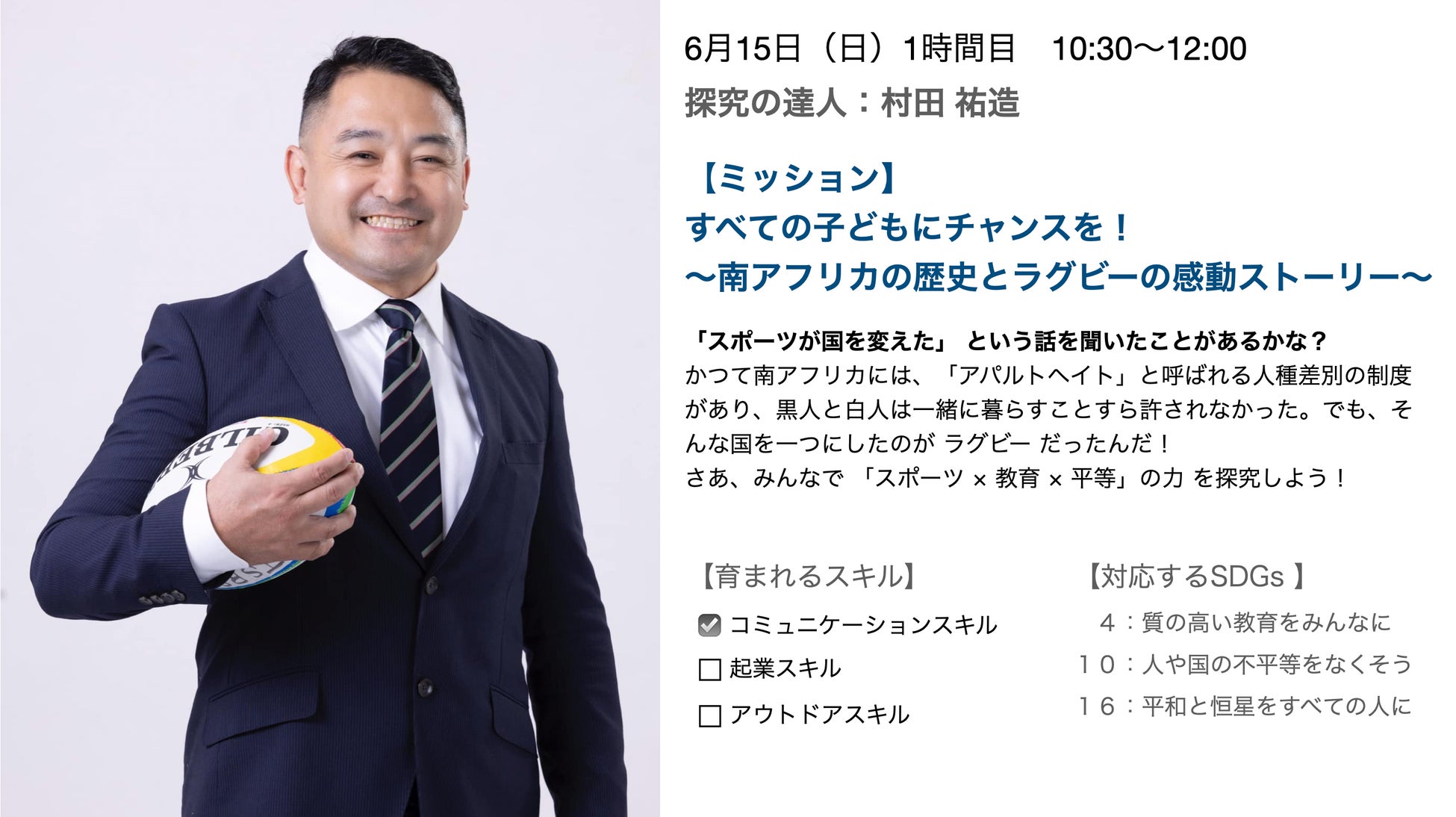 7月27日(日) 探究の達人:村田祐造(東大卒唯一の元プロラグビー選手) 夏休みの自由研究を考えよ! 〜好きな本を選んで、探究してSDGsの課題を解決しよう〜 |