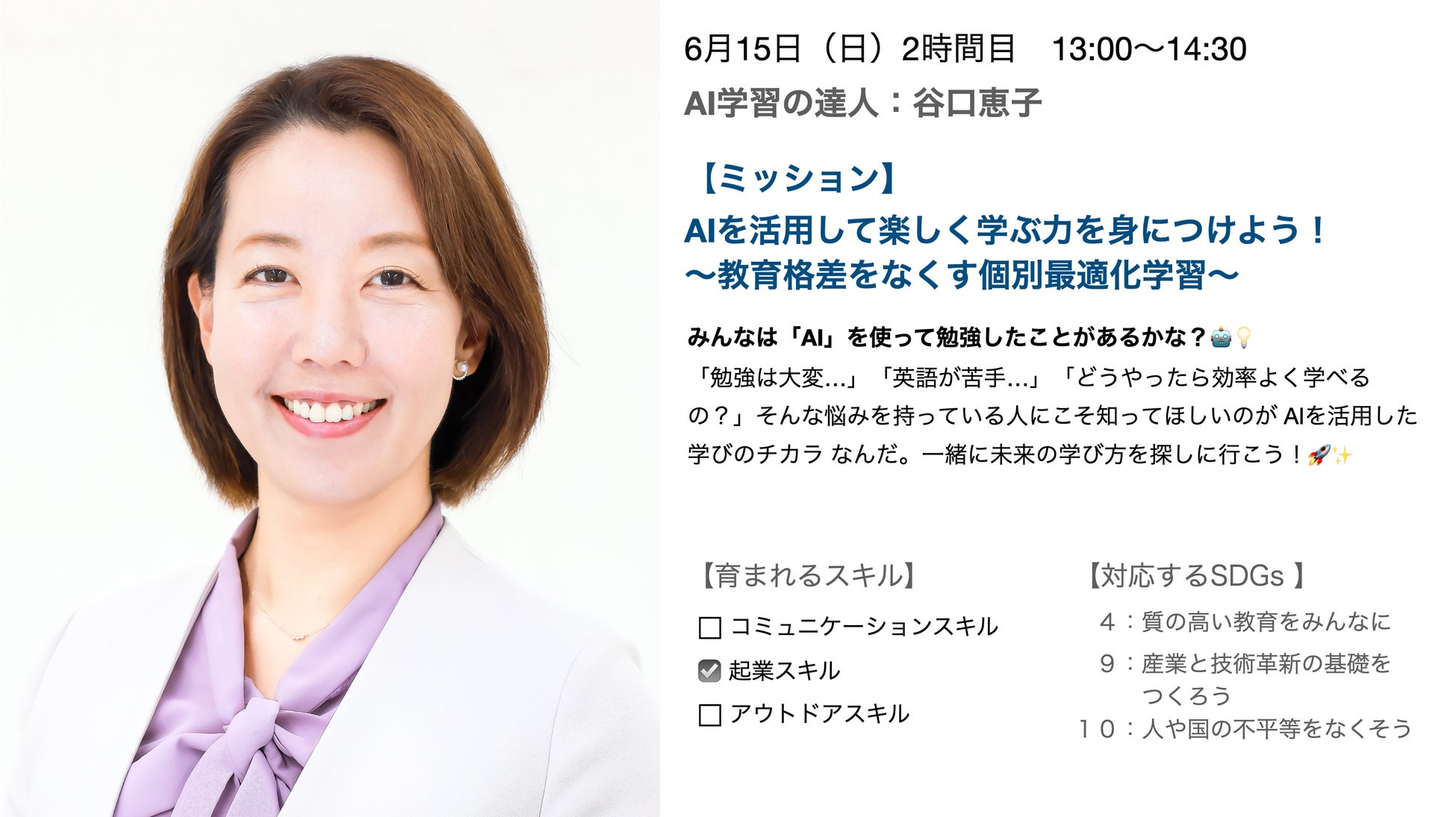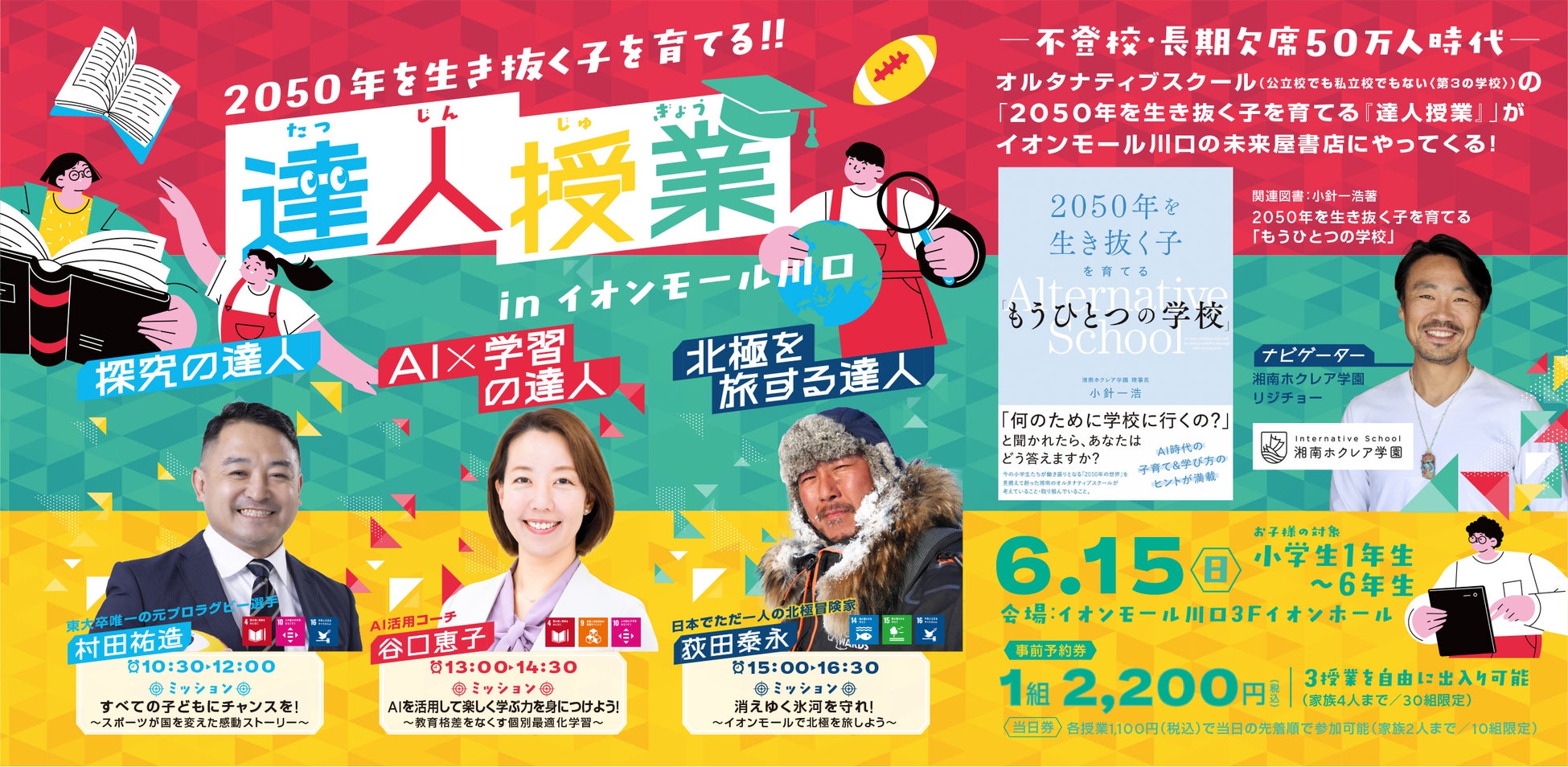 6月15日(日)、未来屋書店 川口店にて、初回限定の特別イベント「達人授業体験会」を開催いたします。当日は、SDGsをテーマに、探究学習・AI学習・環境学習の3分野で活躍する“達人”たちが登壇。3つの授業を一度に体験できる貴重な機会です。