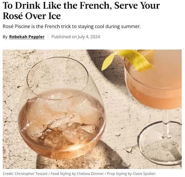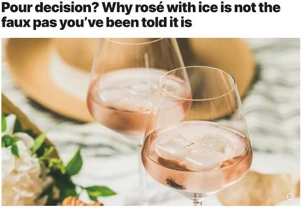 氷の上からロゼワインを注いで、フランス流に楽しみましょう (出展) https://www.foodandwine.com/wine-with-ice-8673563
