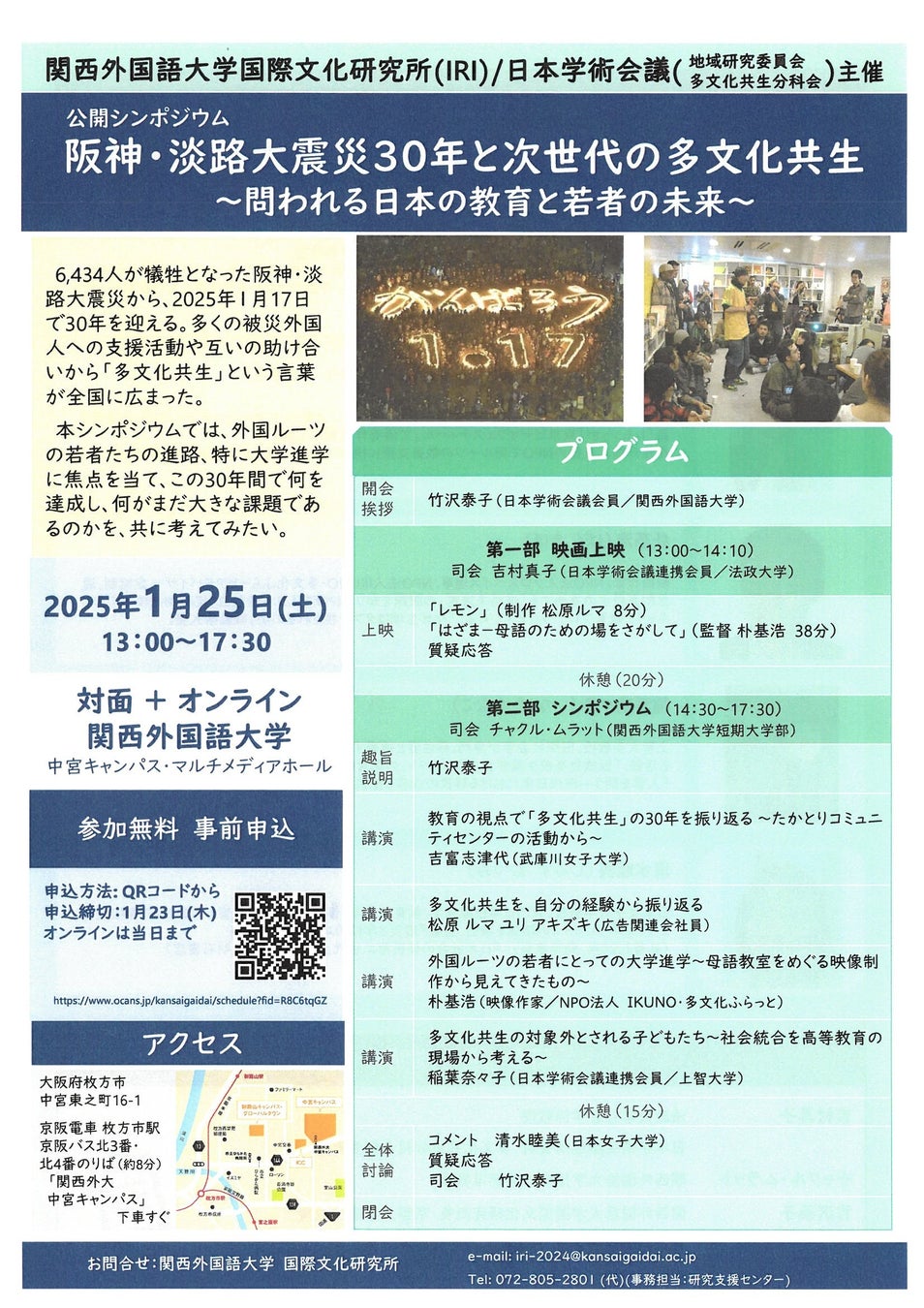 関西外国語大学国際文化研究所は1月25日(土)午後1時から、中宮キャンパスで公開シンポ「阪神・淡路大震災30年と次世代の多文化共生~問われる日本の教育と若者の未来~」を開催。オンライン配信もあります。