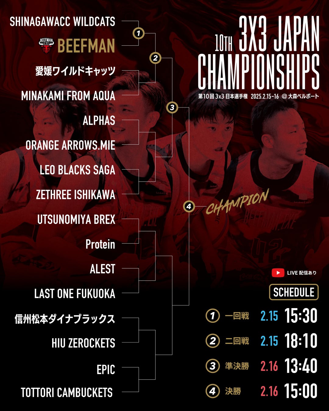 BEEFMANの初戦は、昨年の「3x3.EXE PREMIER PLAYOFFS」でも激闘を繰り広げたライバル「SHINAGAWA CC WILDCATS」。現在日本選手権3連覇中の「UTSUNOMIYA BREX」2024年プレミア王者「ALPHAS」も出場しており、優勝を目指す上では避けて通れない相手です。
