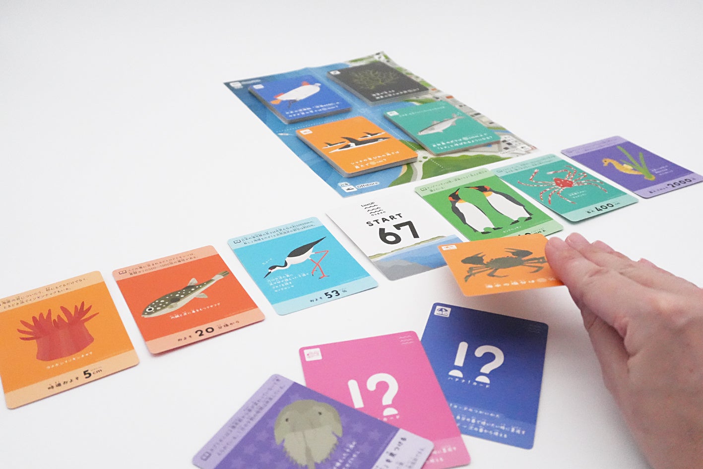 ポップなイラストのカードには、ちょっと考えてみたくなる数字や、だれかに教えたくなる雑学がたくさん。ゲームなのに本や図鑑のような楽しみがつまっています。大勢でワイワイ遊べて、一人で静かに楽しむこともできる、新しいタイプのカードゲームです。