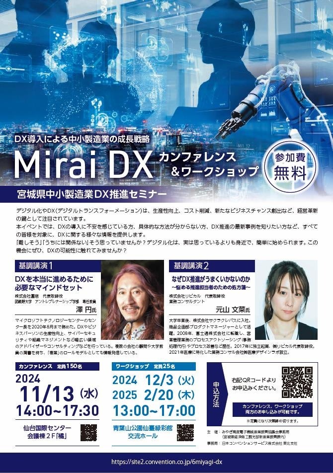 宮城県では、2024年11月13日(水)、「宮城県中小製造業DX推進セミナー Mirai DX カンファレンス」を仙台国際センターで開催いたします。
