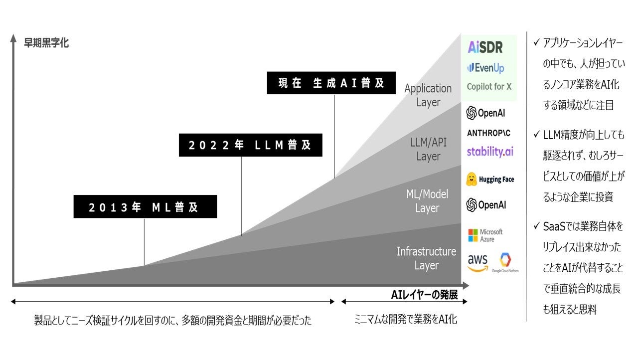 AIを活用するために多額の開発資金と時間が必要だった時から、最小限のコストパフォーマンスで働き方や生活様式をアップデートできる時代に突入しています。即ち、LLMの計算量で競うといったフェーズが終わり、基盤はコモディティ化する前提で、各業界の特定業務をAI技術で代替していくアプリケーションによる課題解決に取り組むスタートアップが誕生する時代が到来すると思料しております。