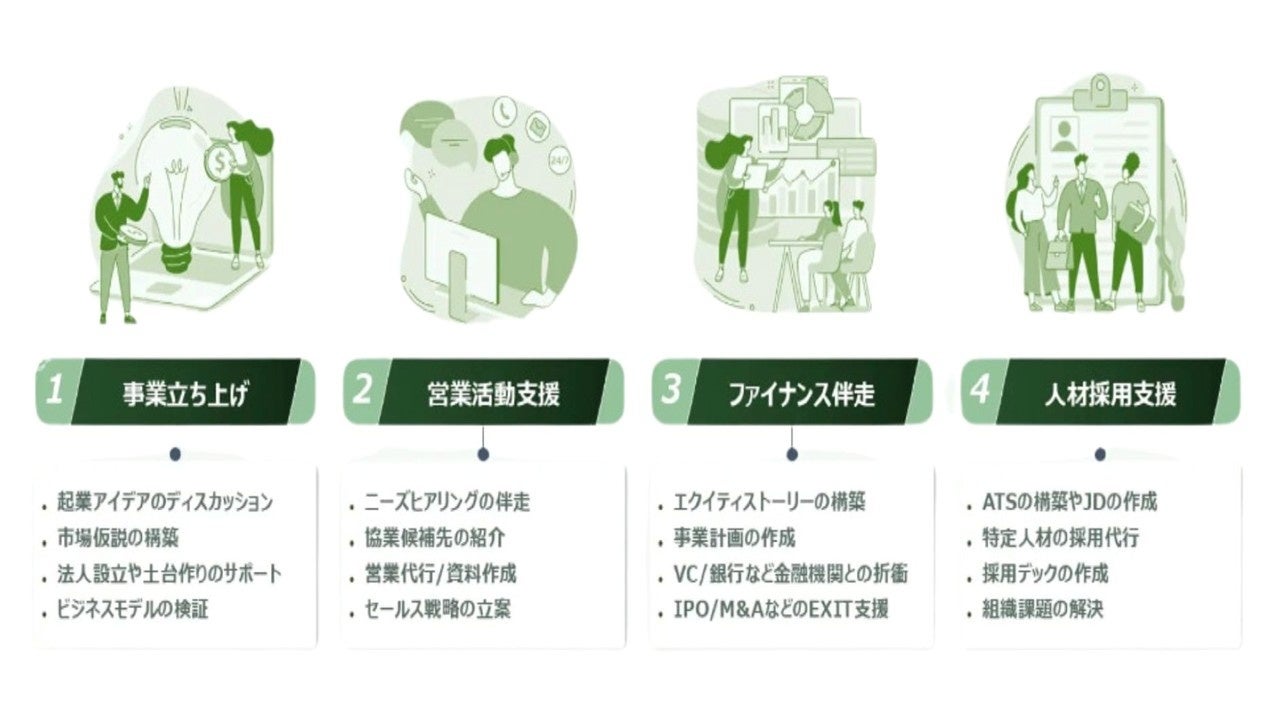 出資先企業とは原則として週次で個別定例ミーティングを行いながら、創業期/プレシード期のスタートアップ企業に必要とされる事業戦略策定、ファイナンス、チームビルディング、顧客開拓、その他経営全般の幅広い支援を通じて伴走いたします。