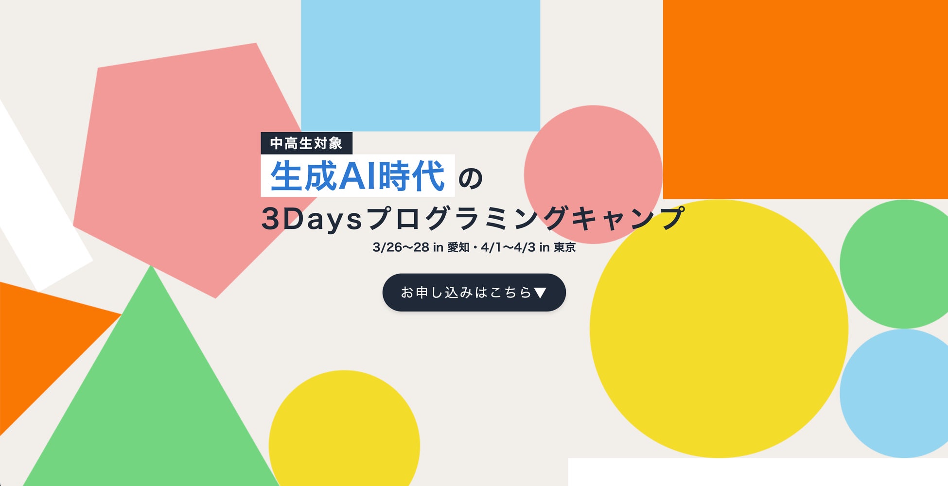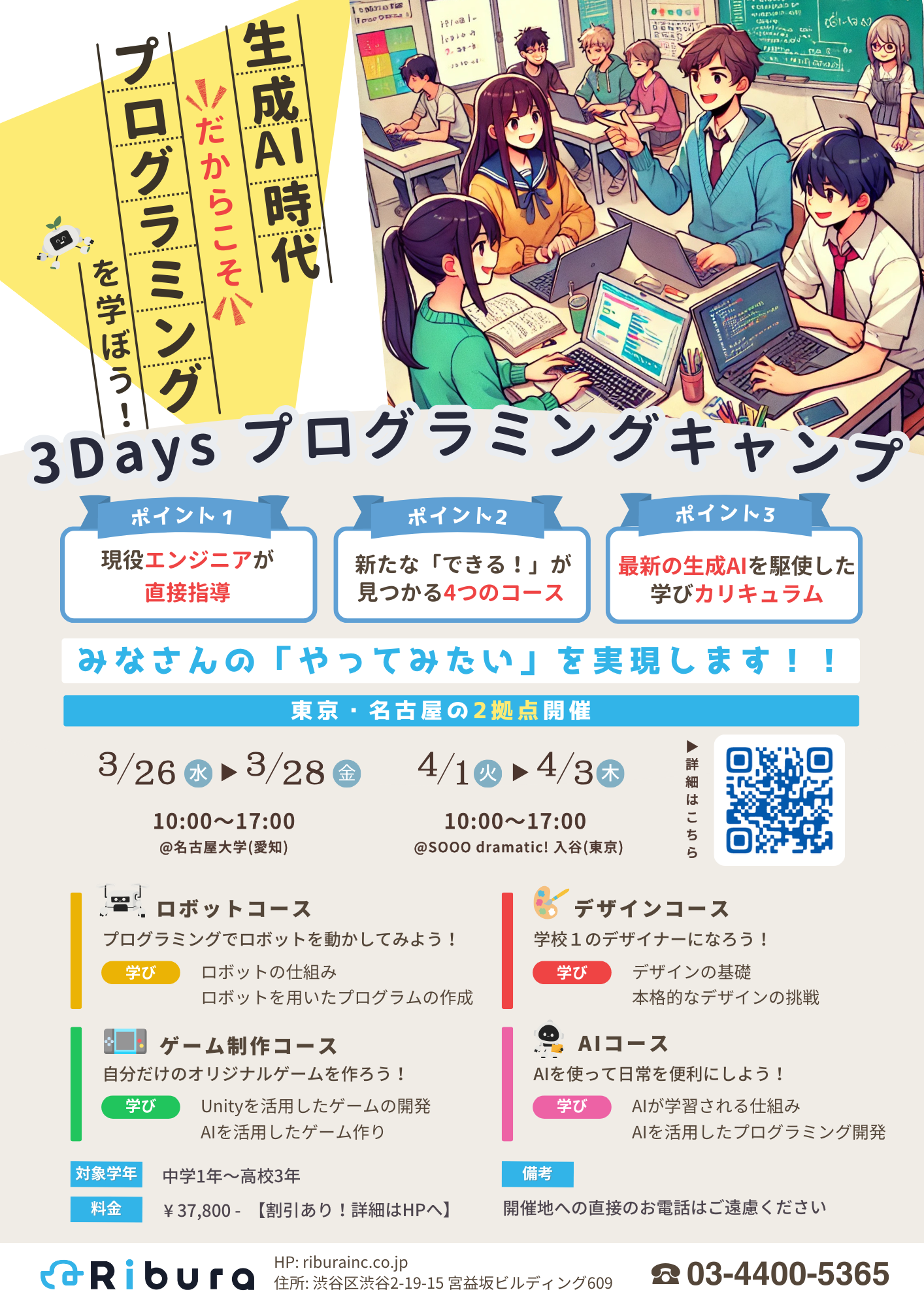 株式会社Ribura(本社:東京都渋谷区、代表取締役社長:伊藤 竜聖)は、2025年春に中高生向けの「3Daysプログラミングキャンプ」を名古屋・東京で初開催します。本キャンプでは、最先端のIT技術を実践的に学べる4つのコース(AI・ロボット・ゲーム開発・デザイン)を提供し、「AIと一緒に学ぶ、新しいプログラミング体験」を通じて、未来のITスキルを身につける機会を創出します。
