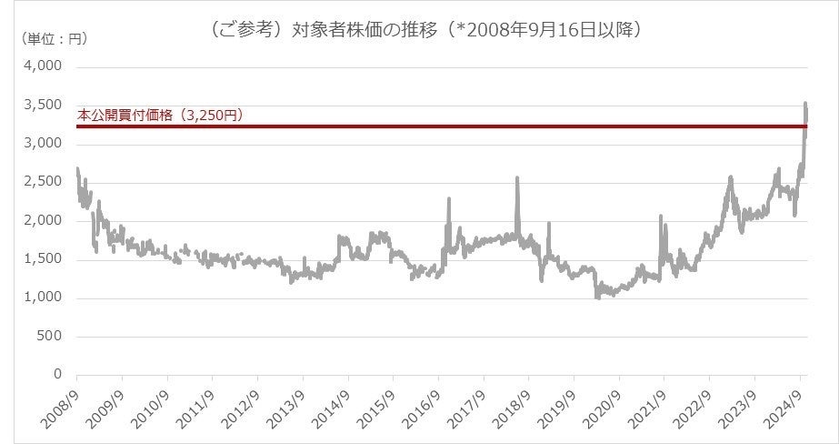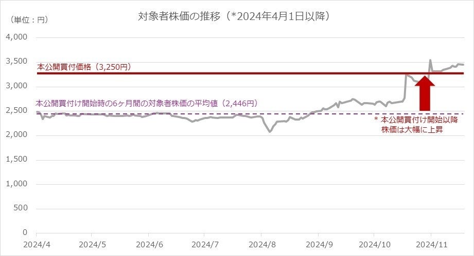 特に、下記「2.株価について」につきましては、今後仮に対象者の株価が現状の水準(本書提出日の前営業日である2024年11月20日時点の対象者株式の終値は3,435円)で推移したことにより、本公開買付けの結果、買付予定数を大幅に下回った場合は、本公開買付けは対象者との資本業務提携による企業価値向上を目的の一つとしているところ、当該目的が達成されないことにより株価が上昇する旨の市場の期待が損なわれることから、本公開買付け終了後に対象者株式の株価は、公開買付価格(3,250円)を下回ることが想定されると公開買付者は考えていることから、対象者株主においては、本書に記載した公開買付者の意見も踏まえて本公開買付けの応募についてご判断頂きたいと考えております。