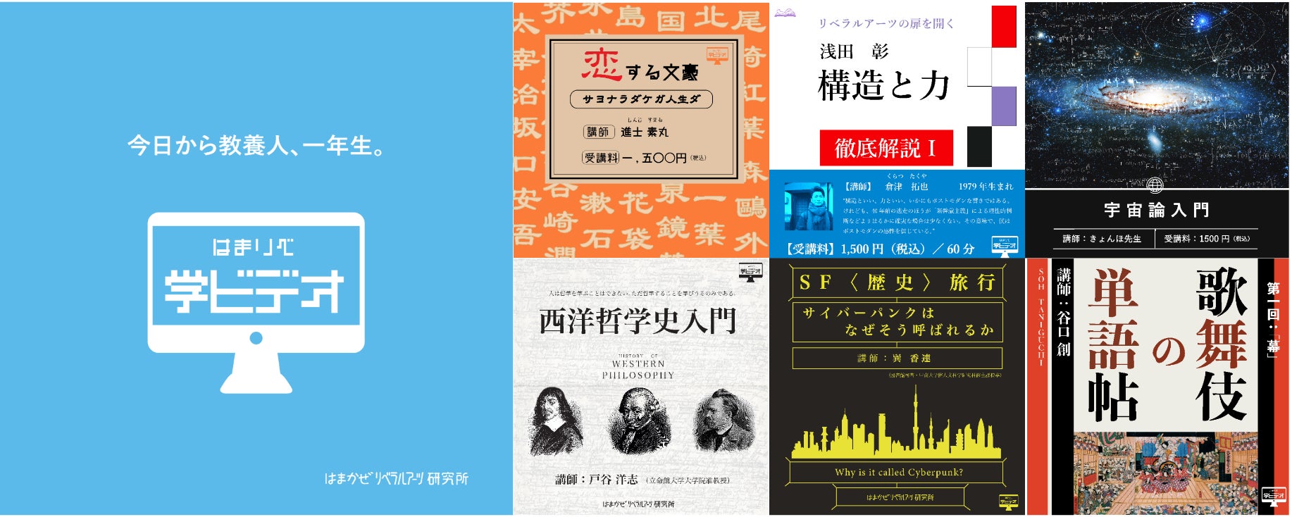 この度、本格的な学びのスタートアップとして、リベラルアーツを揃えたオンラインレクチャー「学ビデオ」の講座数を10月25日から6講座とし、本格稼働させます。「学ビデオ」は、「高い、時間がない、学ぶ場所がない」という学びに関する3大障壁を取り除き、従来のカルチャースクールの約半額となる1500円という受講価格、約60分という短い受講時間、そしてオンライン運用で全国どこからでも受講可能な体制を整えました。講師には『文豪どうかしてる逸話集』の進士 素丸やNHK「100分de名著 ハイデガー『存在と時間』」にも出演した気鋭の若手哲学者、戸谷 洋志などが名を連ねます。