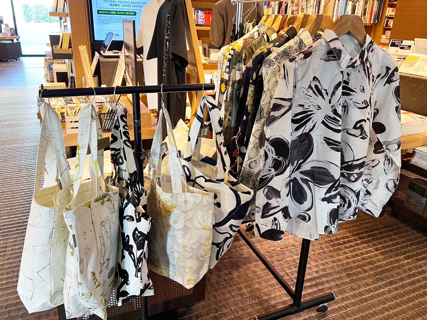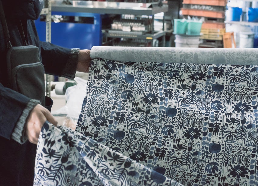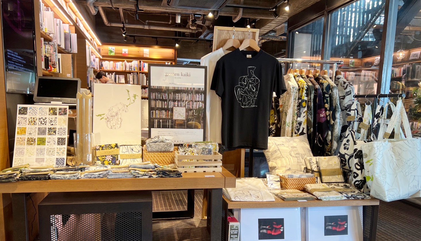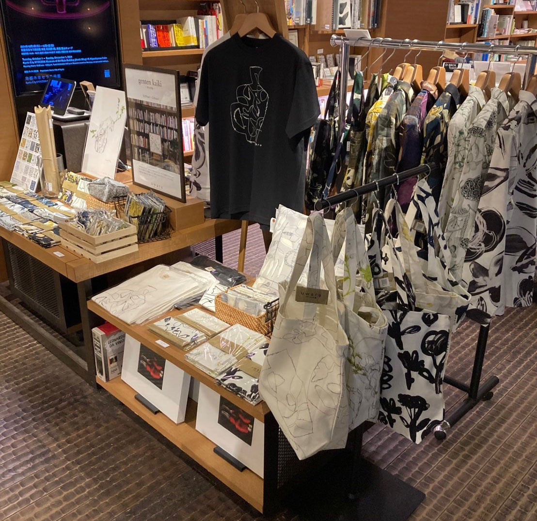 uwaruのテキスタイルはクリエイティブディレクターの松生剛の手描きスケッチブックから生まれたユニークな植物たちを自由な発想と繊細な筆致で描いた植物画が特徴で、あたたかみのある手描き図案は京都を中心にじわじわと人気を集めています。今回、5回目となる京都岡崎蔦屋書店でのPop Upイベントでは、テキスタイル小物、コットンシャツ、バッグ類など定番商品に加えて、新作も作りました。布製品はすべて京都の染工場で捺染し、京都で手仕事による縫製を貫く、メイド・イン・キョウトにこだわっています。