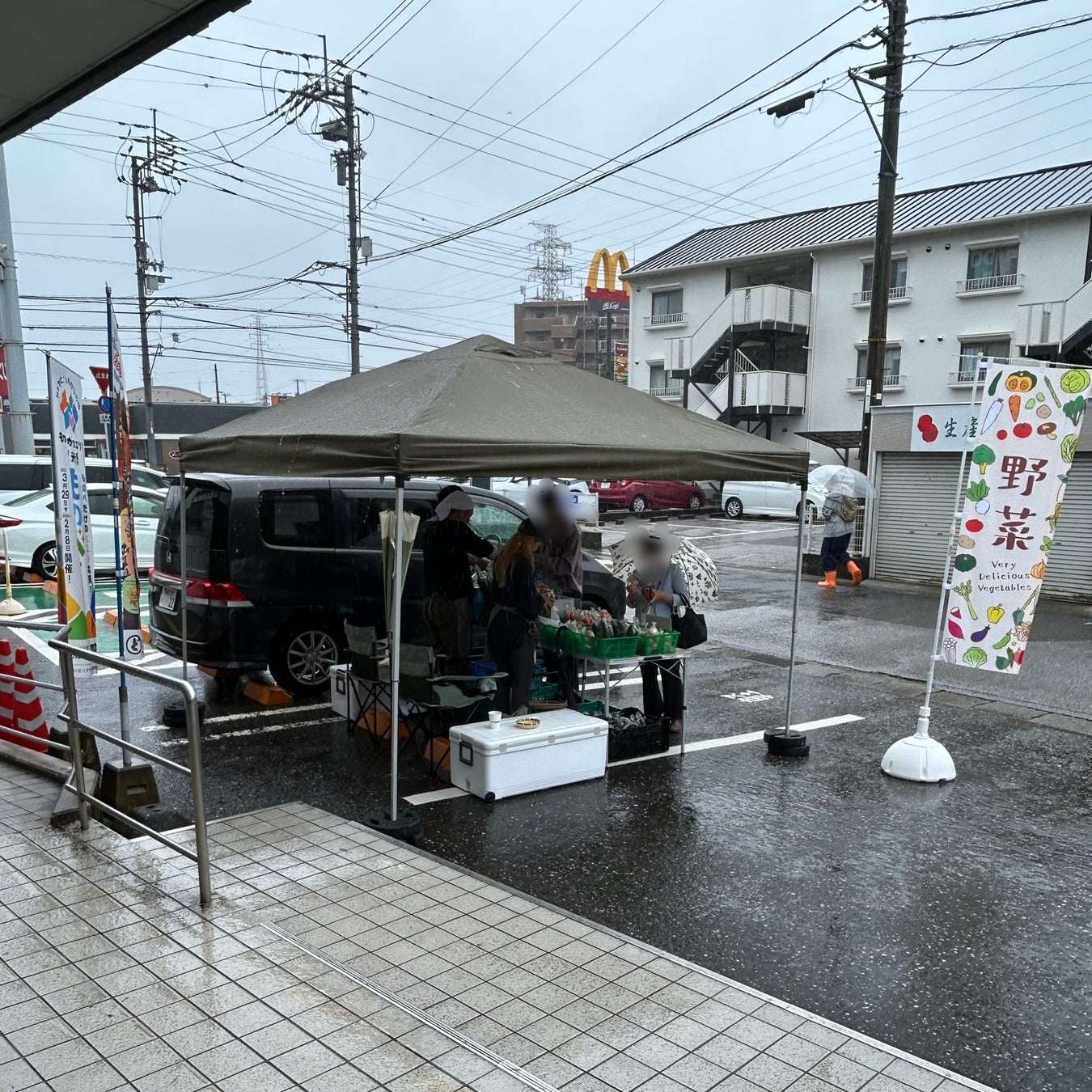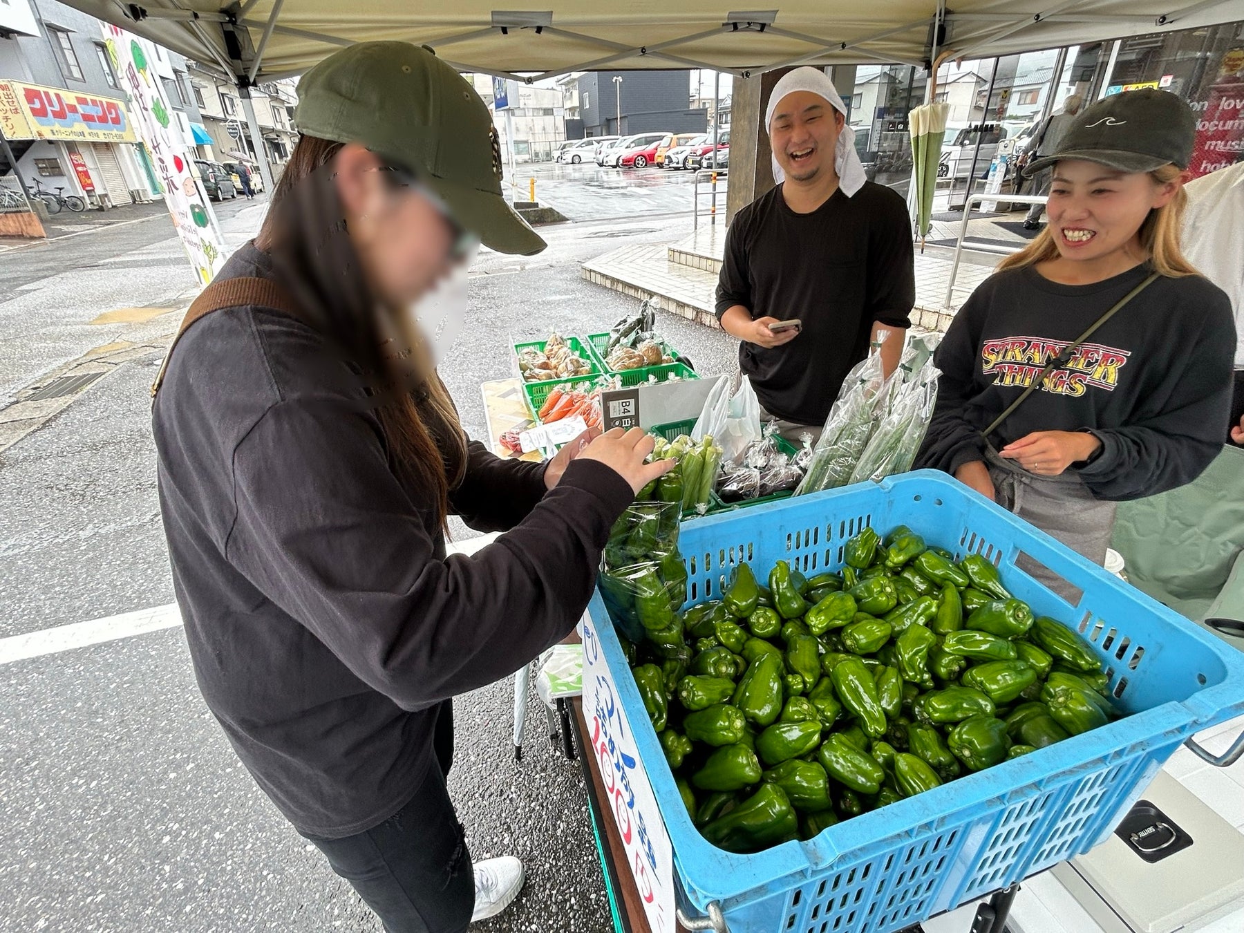 スマホでは得られない、人と人とのあたたかいやり取り。声をかけ、手を振り、笑い合いながら野菜を買ってもらう。そんな昔ながらの八百屋の風景を、令和に復活させたいという思いから、私たちは雨の中、テントを広げ、野菜とともに立ちました。