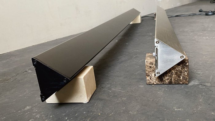 数ある図形の中でもシャープな印象の三角形。その面白さに惹かれ、三角柱デザインのフロアランプに落とし込みました。美しく均整のとれた形を実現するため、アルミ押出成形という技法を採用し、試作を重ね、ようやく満足のいくものが完成しました。