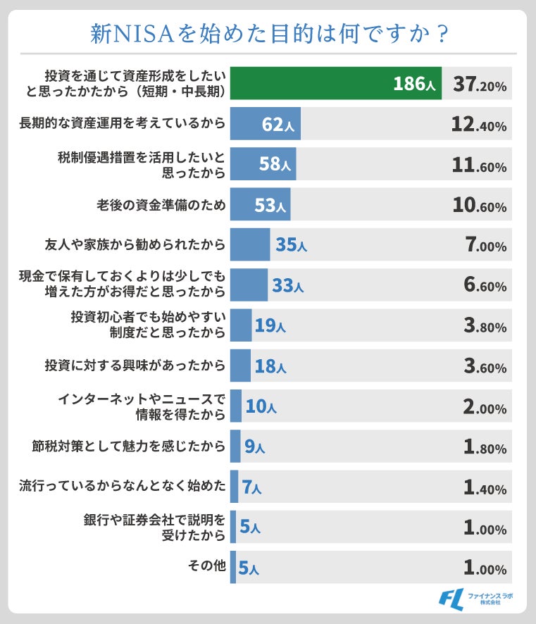 「新NISAを始めた目的は何ですか?」という質問に対して、最も多くの回答が集まったのは「投資を通じて資産形成をしたいと思ったから」で、全体の37.20%(186人)を占めました。