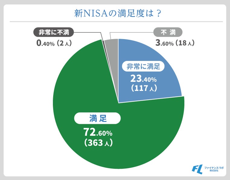 全体の72.6%(363人)が「満足」と回答し、さらに23.4%(117人)が「非常に満足」と答え、合わせて96%の利用者が新NISAに対して肯定的な評価をしています。