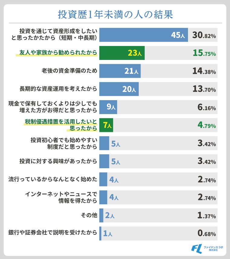 注目すべき点は「税制優遇措置を活用したいと思ったから」という理由が41人(約27%)と多く、投資歴1年未満の人(7人)に比べて大幅に高い割合を示しています。