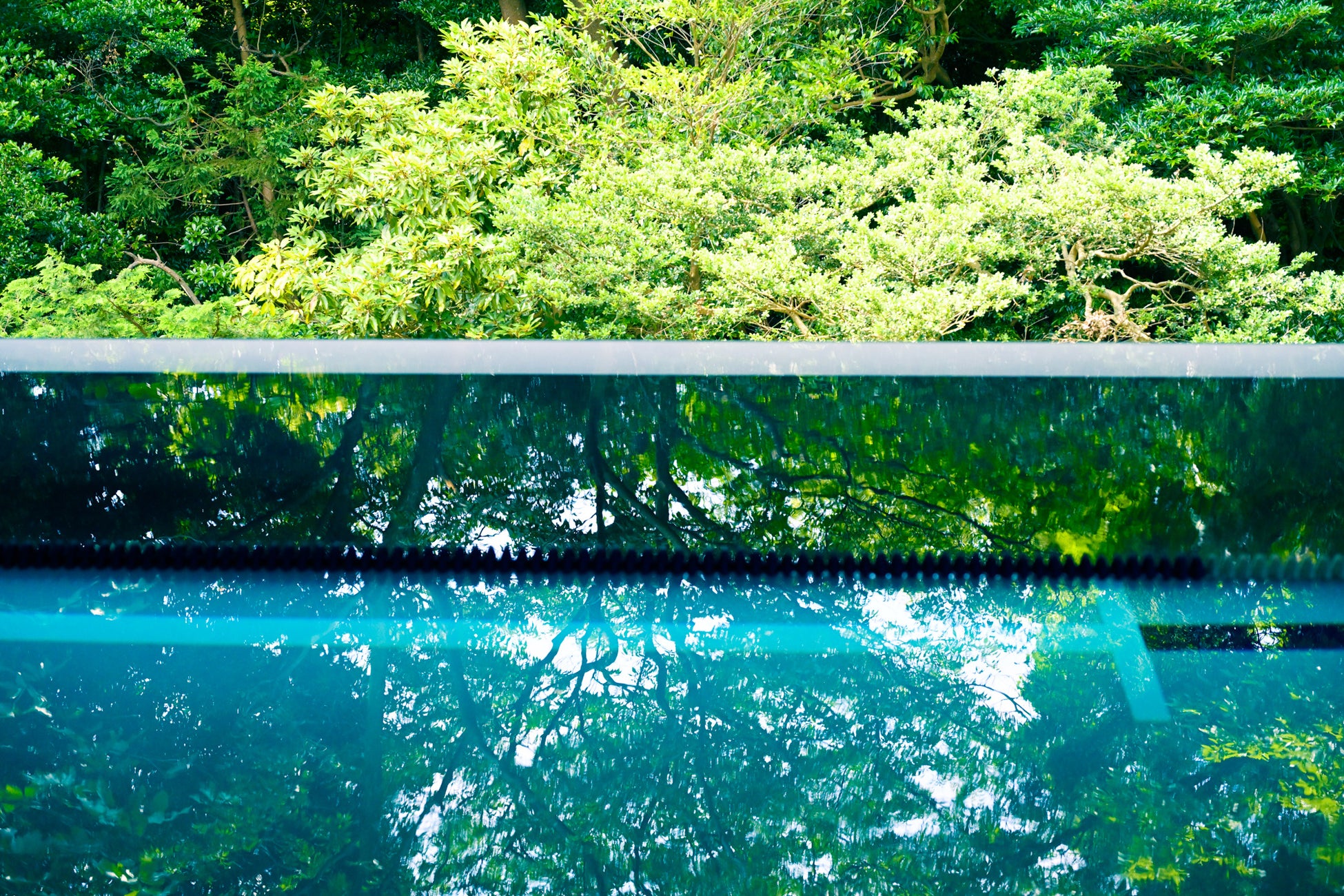 四季の移ろいを感じる森に溶け込む25mスイミングプール、そして全国的にも珍しい水深8mのダイビングプールは、水と深く一体となるための空間。