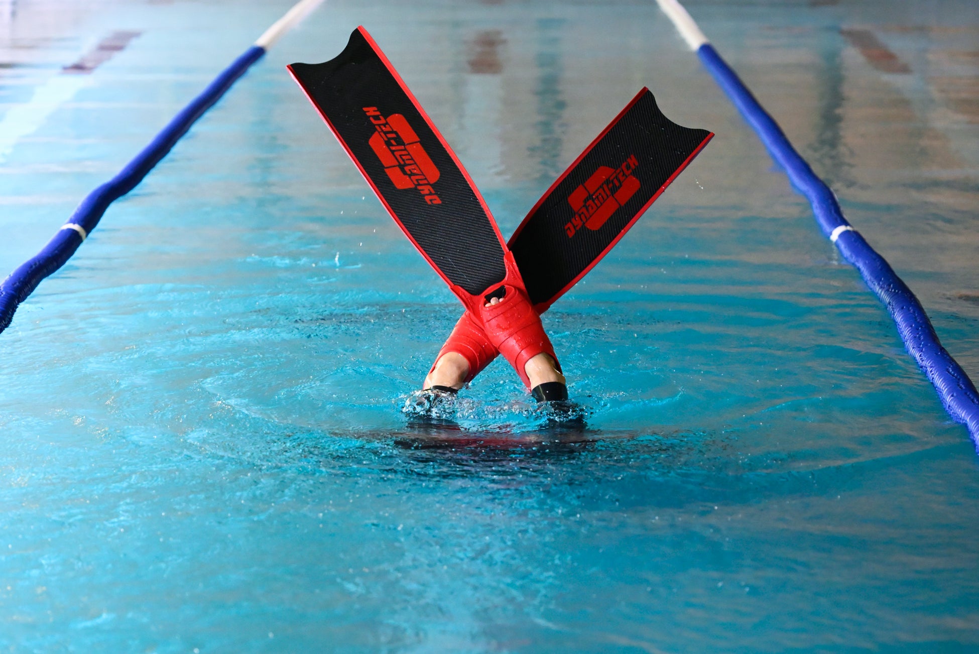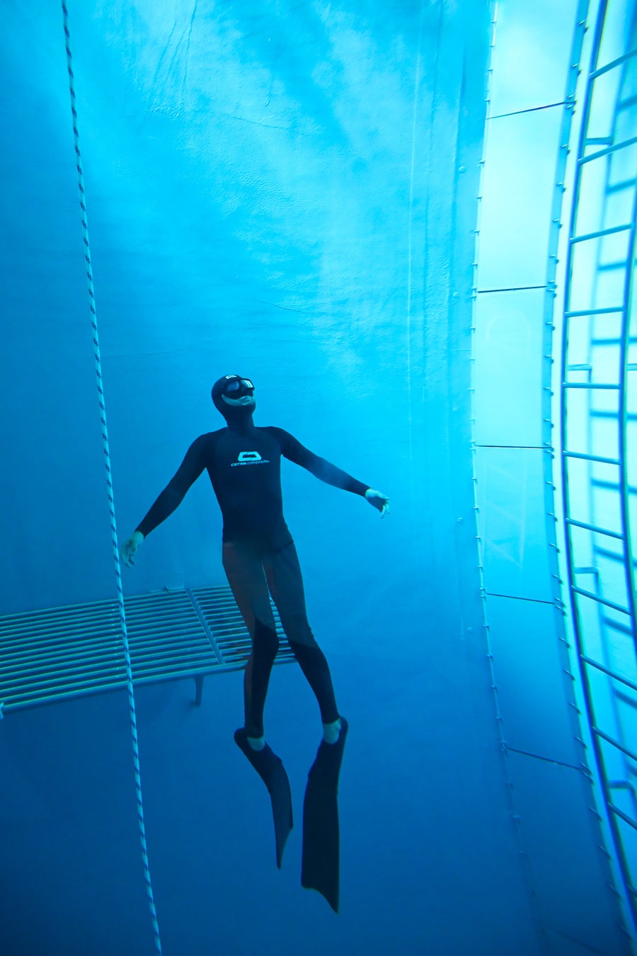 スキンダイバーによる素潜りの実践。息を止め、水の中へ深く潜っていく姿は、息をのむ美しさ!プール内の大きな窓からは、デモンストレーションの様子を間近でご覧いただけます。水面下で繰り広げられる潜水技術をご堪能ください。