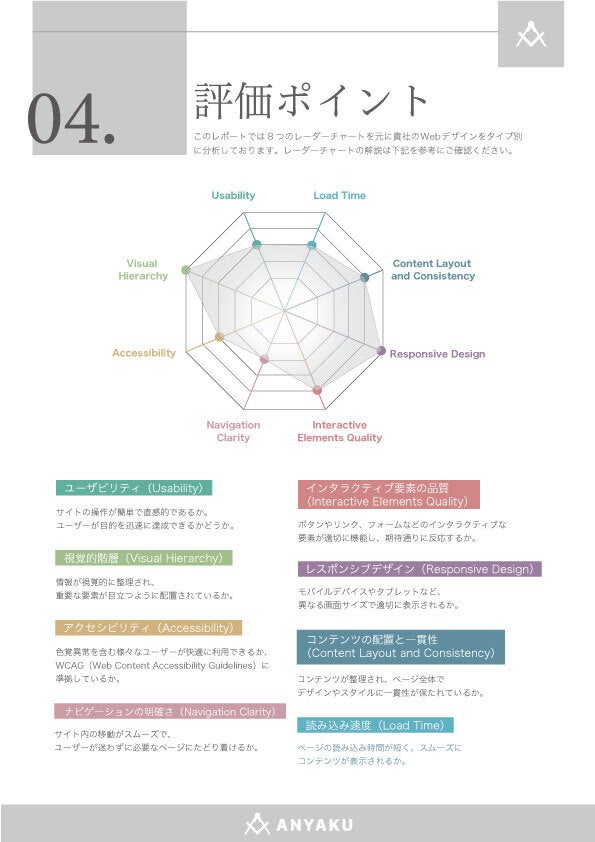 ・ユーザビリティ・視覚的階層・レスポンシブデザイン・読み込み速度・ナビゲーションの明確さ