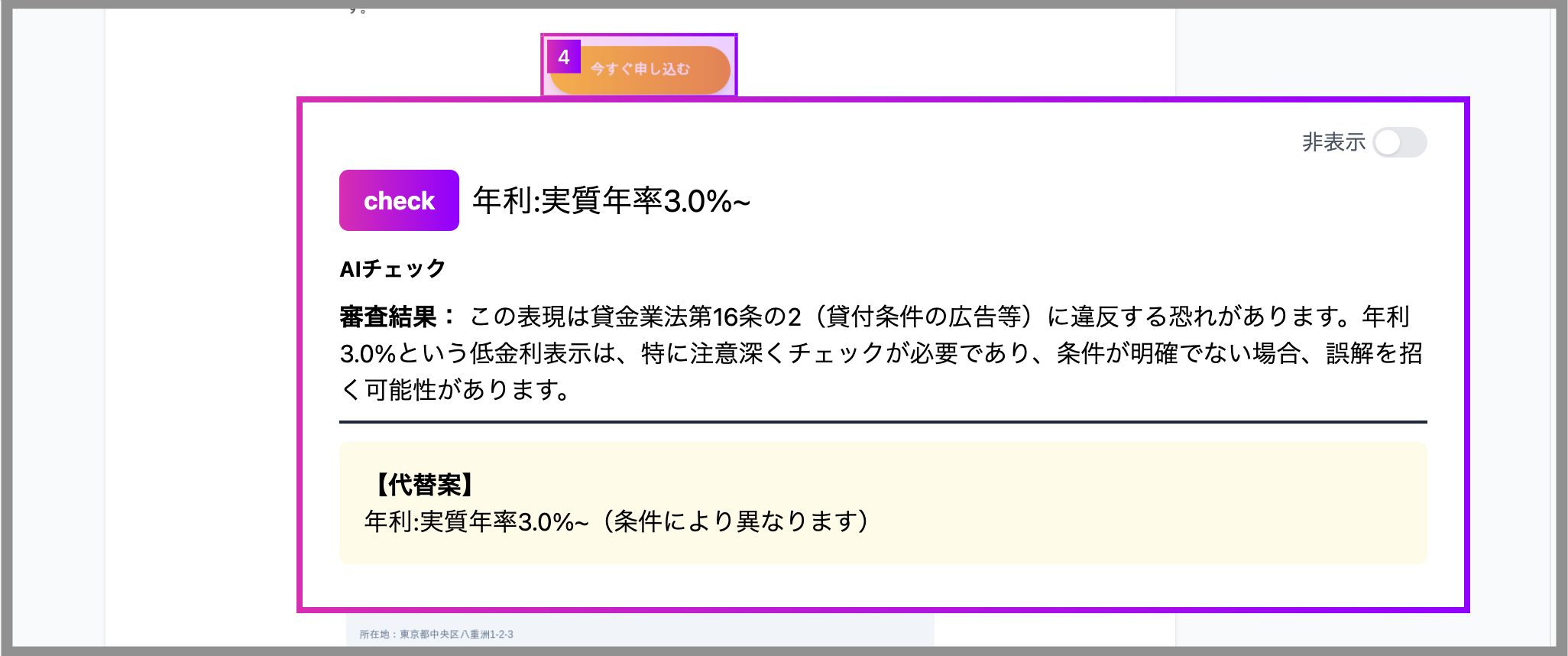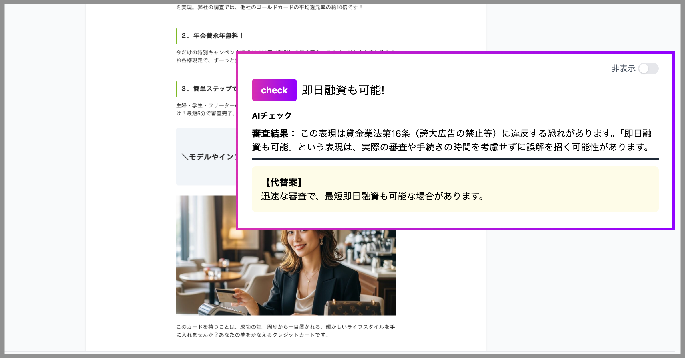 これにより、金融・保険・投資・ローン・クレジット関連のLP・バナー・記事広告においても、専門知識がなくても法令リスクを可視化できるようになりました。