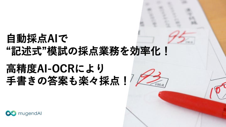 株式会社mugendAIは、大学過去問添削AI『カコテン』の技術を応用し、各都道府県の高校入試対策模試の答案をAIにより自動採点する技術の検証を完了しました。今後は、模試事業者様との共同開発により実用化に進む予定です。