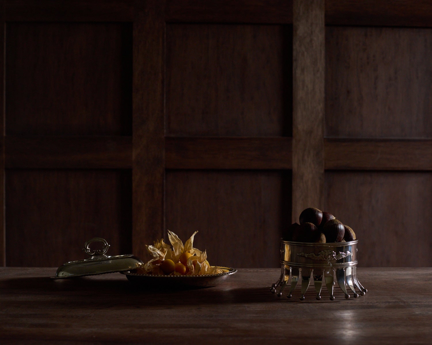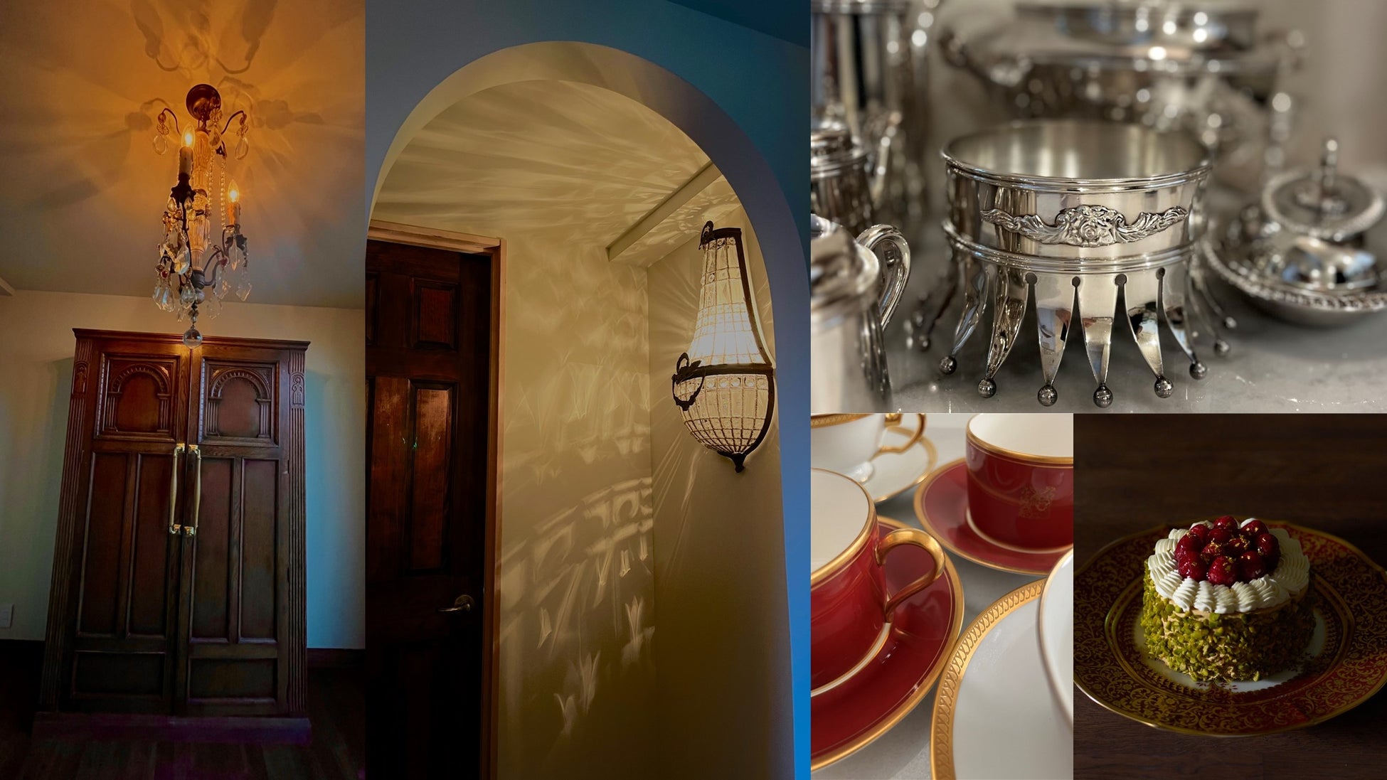 店内に茶室を作り実際に点前を見ていただけるようにしております。またパティシエがこれまで勤務してきた老舗フレンチレストランのイメージを再現するように、調度品やスツール、皿や食器の細部にまでクラッシックなものを揃え、洋館に来たかのような錯覚を覚える店内になっています。