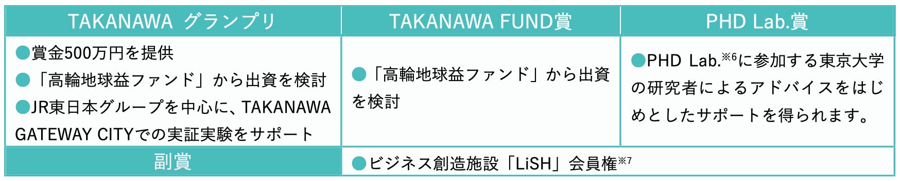 街での実証も見据えた事業アイディアを募集するピッチコンテストです。賞金や「高輪地球益ファンド」からの出資検討※5、TAKANAWA GATEWAY CITY での実証実験支援や東京大学の研究者によるアドバイスを受けられる権利など、様々な賞をご用意しています。