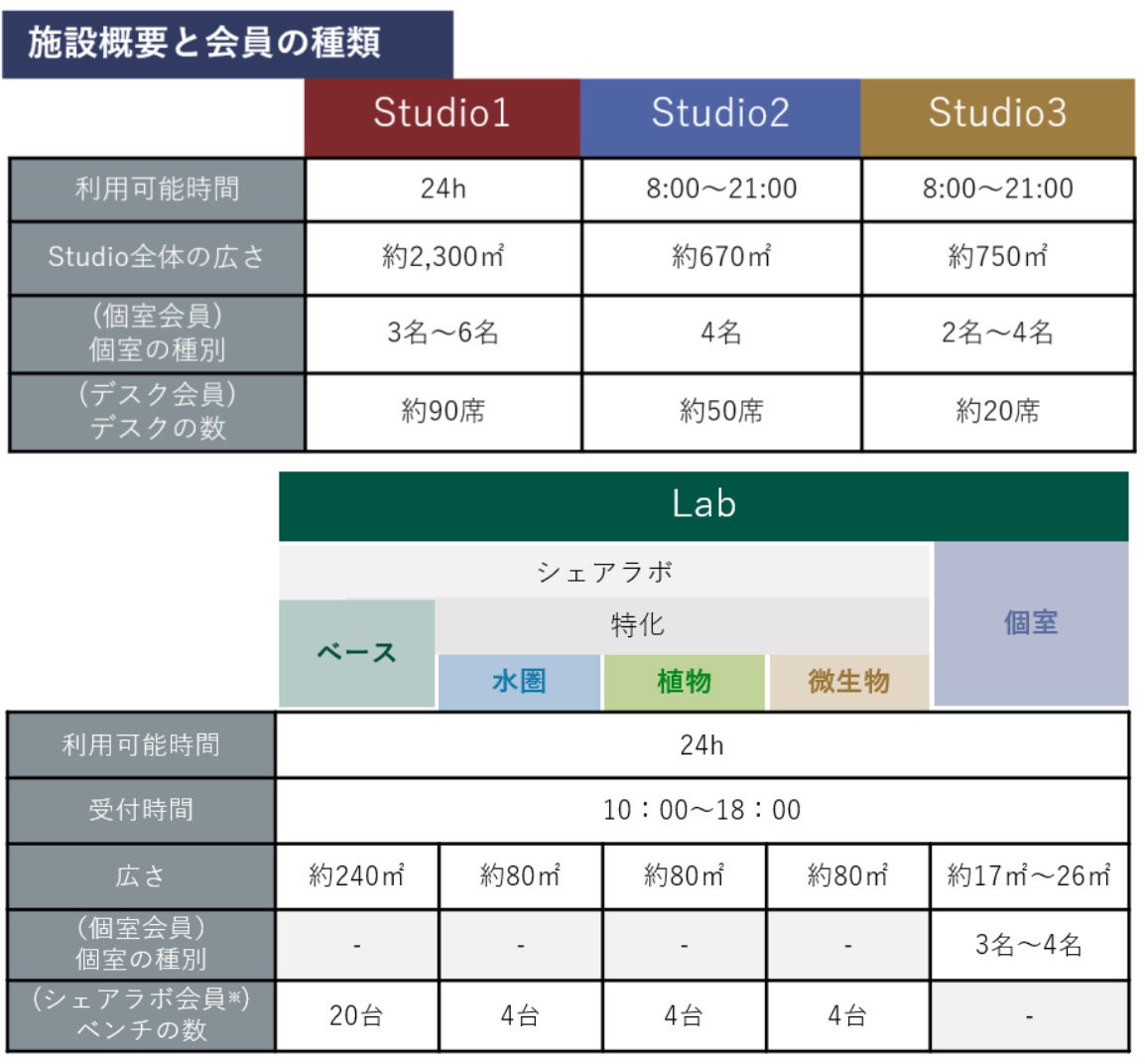 個室やコワーキングスペースに加え、ベースラボ、水圏ラボ、植物ラボ、微生物ラボなどのシェアラボを備えているほか、街全体を実験場として、様々なフィールドをご用意しています。