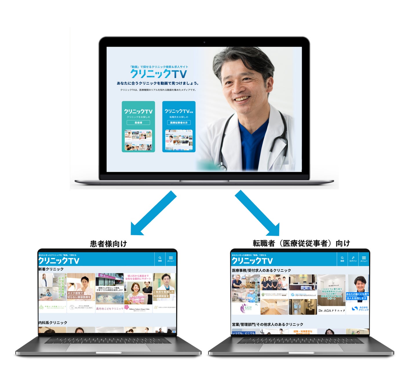 『クリニックTV』は、信用できるクリニックを見つけたい患者様、働きたいと思えるクリニックを見つけたい求職者の皆様と医療機関とを迅速かつ効果的に繋げる、これまでにない動画型マッチングプラットフォームです。