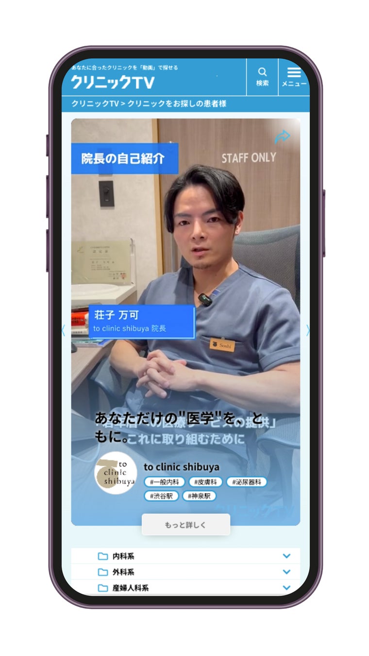 株式会社ベクトル(本社:東京都港区、代表取締役会長兼社長CEO:西江 肇司、東証プライ ム:6058、以下ベクトル)のグループ会社の株式会社クリニックTV(本社:東京都港区、 代表取締役:望月勇哉)は、医療機関に特化した動画プラットフォーム『クリニックTV』 を、2025 年 6 月 2 日より提供開始いたします。