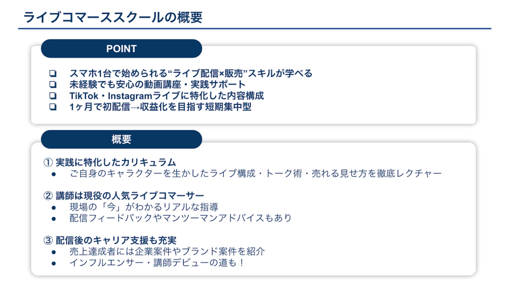 さらに、両社は個人向けにライブコマーススクールも展開予定です。これは、一般の方がTikTokライブを活用して収益を得る「ライバー」として活躍できるよう、基礎から実践までを学べる育成プログラムです。