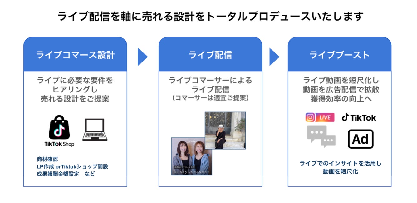 こうした市場環境を背景に両社は共同で、企業がより手軽かつ低リスクでライブコマースに参入できる仕組みとして、企業の商品やサービスをTikTokライブを活用して販売する成果報酬型のライブコマース運用支援サービスを開始いたします。本サービスでは、商材に適したライバーを起用し、企画・運用・分析までをワンストップで支援します。成果が出た分だけ報酬が発生するモデルのため、企業側は初期費用を抑えながら、新たな販売チャネルを構築することが可能です。今後は、ライブ配信を軸としたEC戦略の構築支援から、ライバー育成、販売データの可視化までをワンストップで提供し、より多くの企業の課題解決と売上拡大に貢献してまいります。