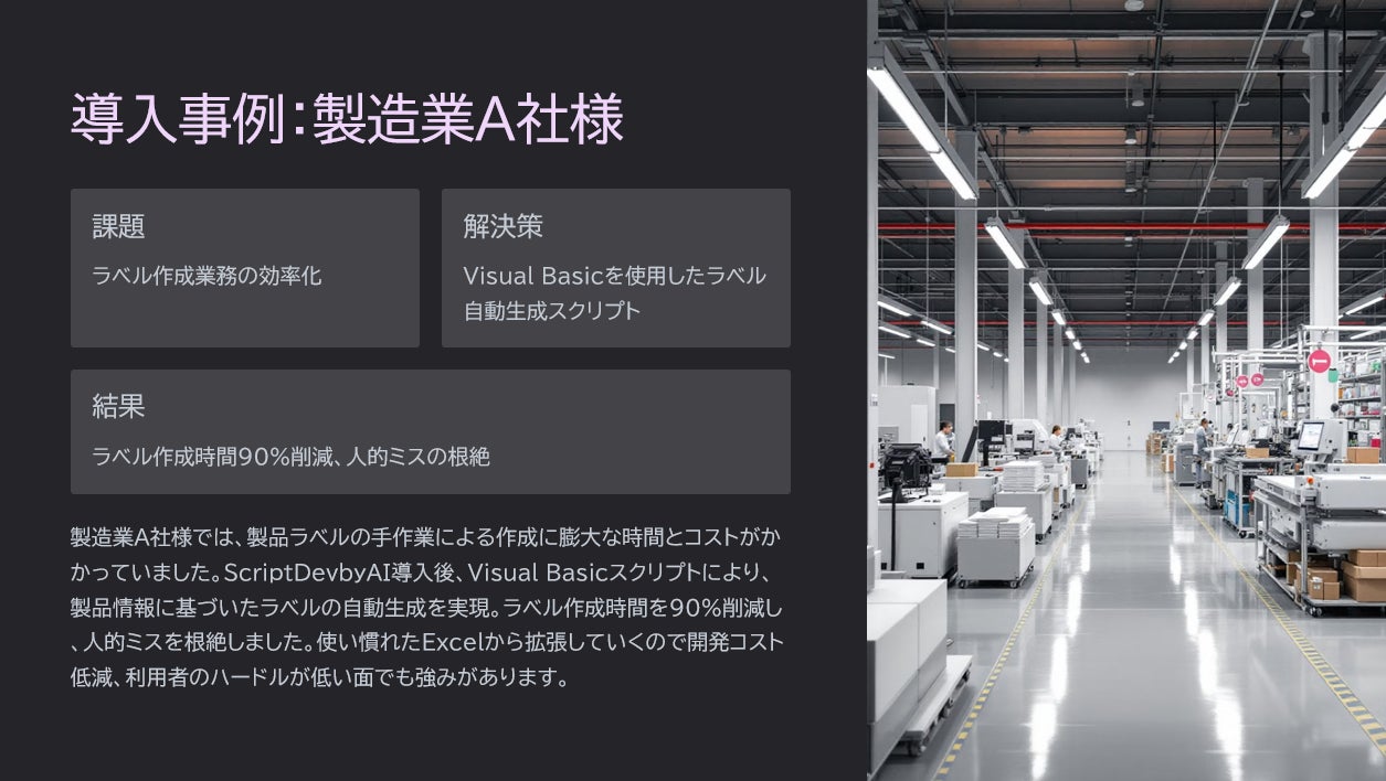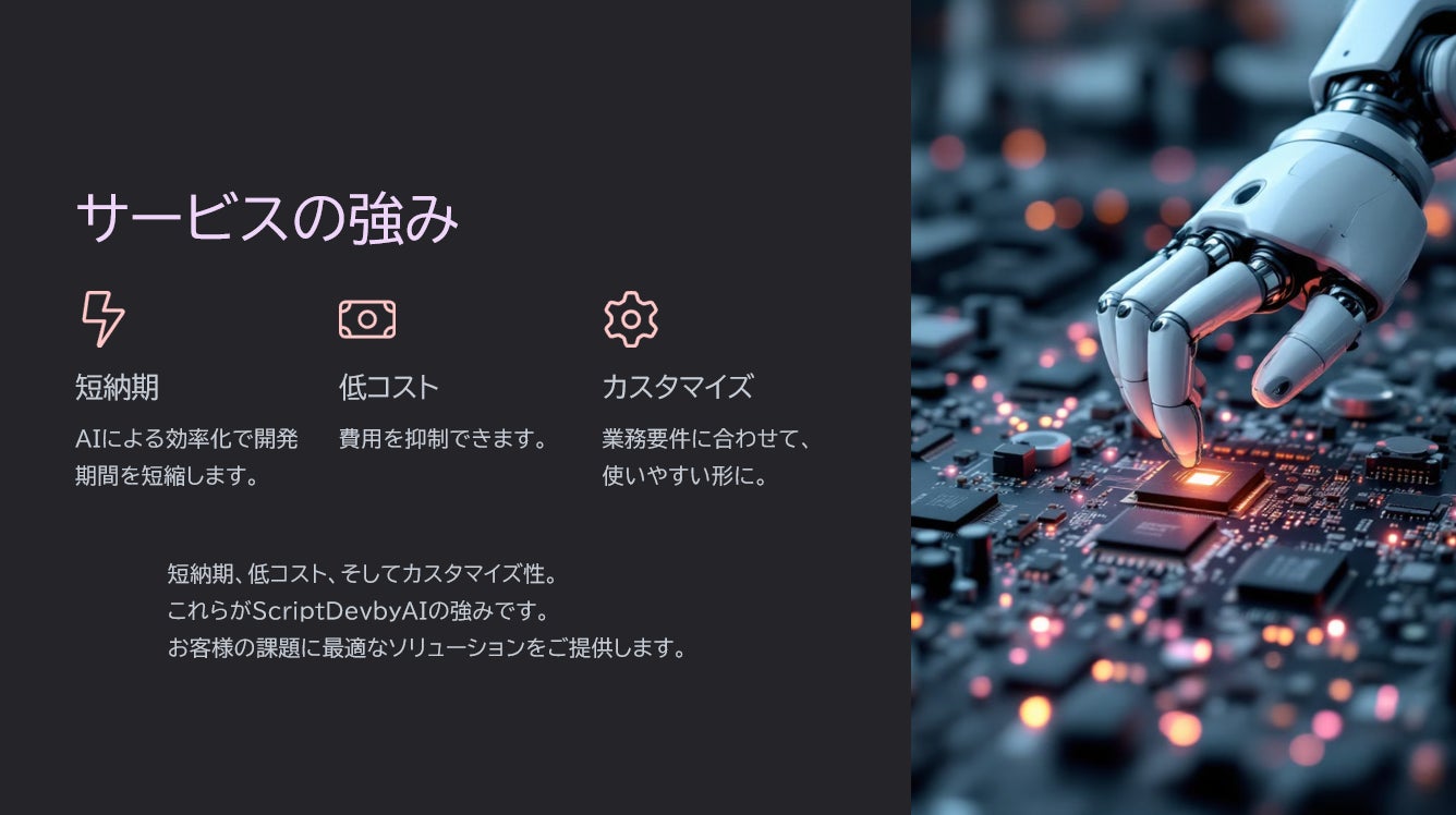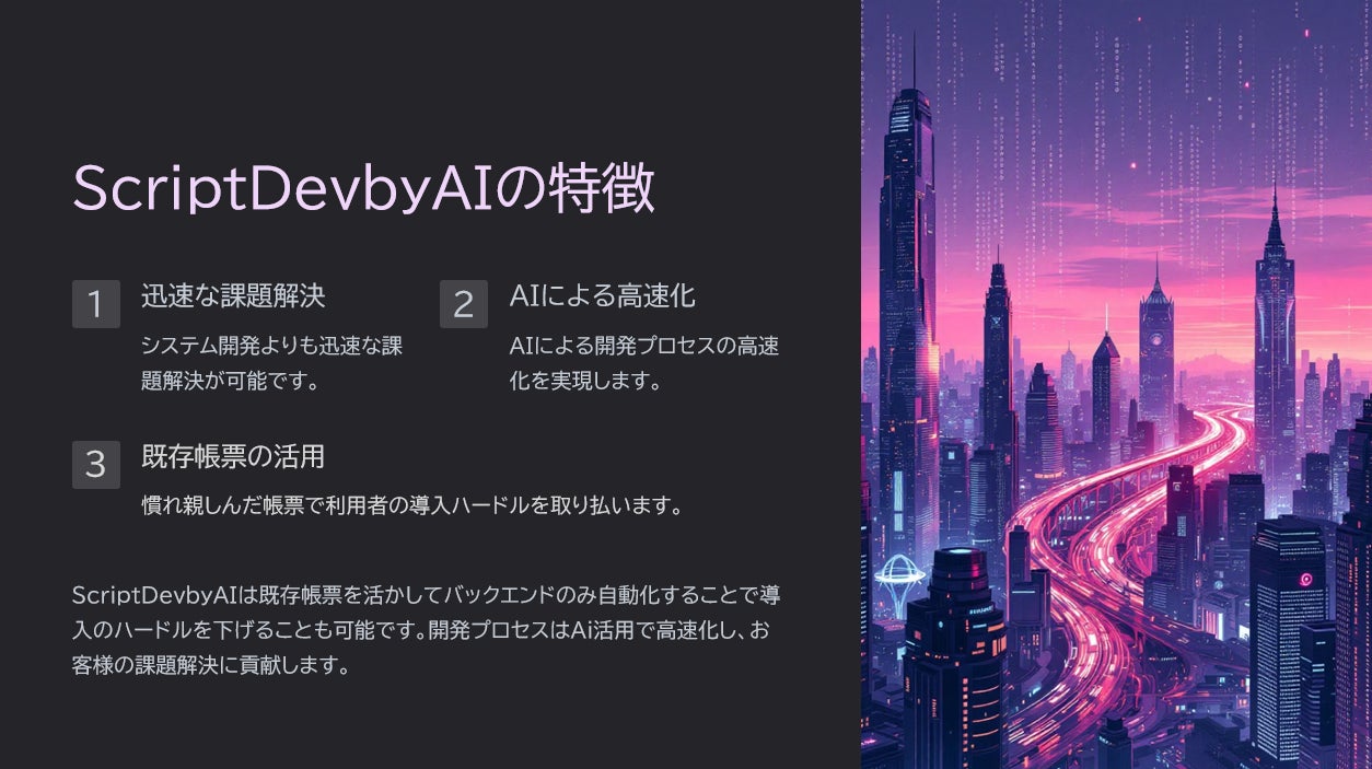 解決するための手法はいくつもあり業務システムでももちろん対応可能ですが、業務を横断的に管理するシステムでは改修に時間もコストも掛かるので、変化のスピードが早い今の時代には即座に対応できてコストを抑えたスクリプト開発の方が適しています。