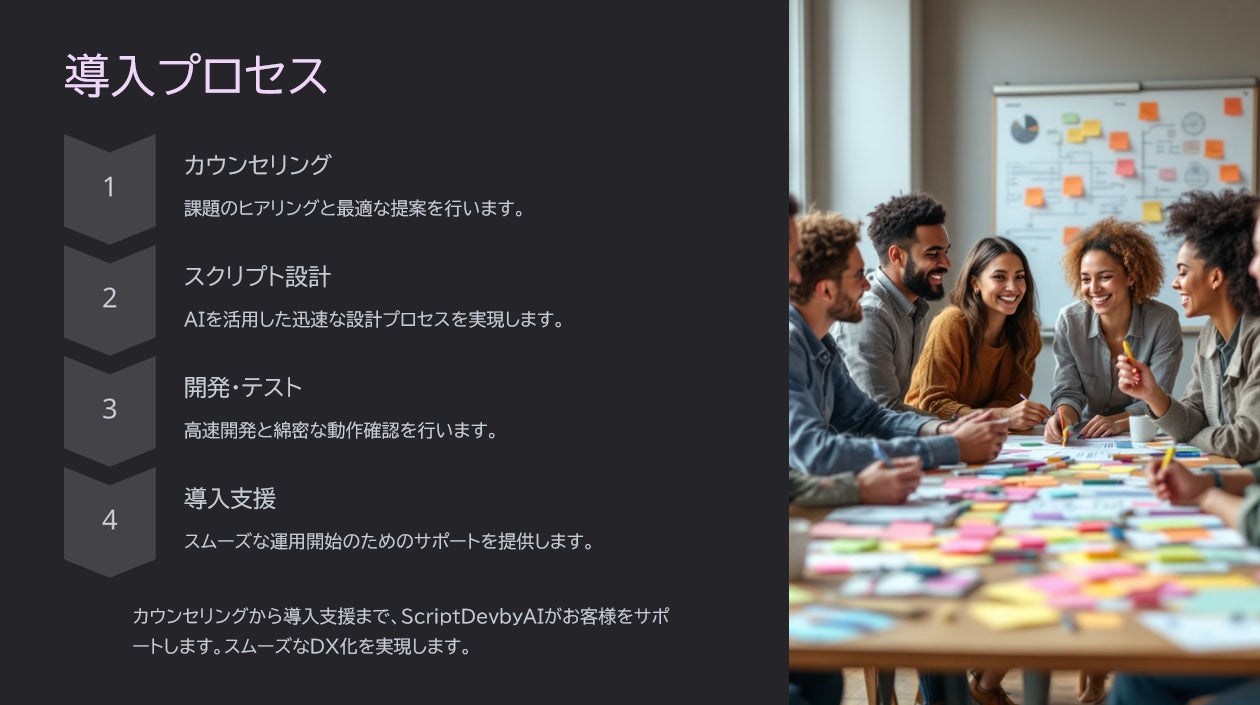 スモールスタートで成功体験を得てDX推進への突破口を作る!導入が進まない中小企業に向けたDX第一歩目に最適なスクリプト開発サービス。