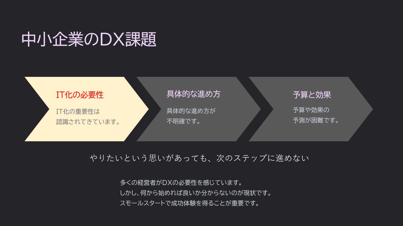 体験に勝る説明はないので、スモールスタートで小さな課題解決から着手して成功の実感を得ることでDX化に向けて好スタートを切っていただきたい。そのために初手は非常に重要で(一歩目でコケると先に進まないどころかアレルギーだけが残り終わってしまう)、低投資ながら投資効率と成功率の高いスクリプト開発から始めることをオススメしています。
