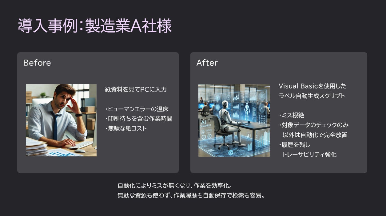 事例紹介ですが、専用プリンタでラベルを印刷しているケースがありました。