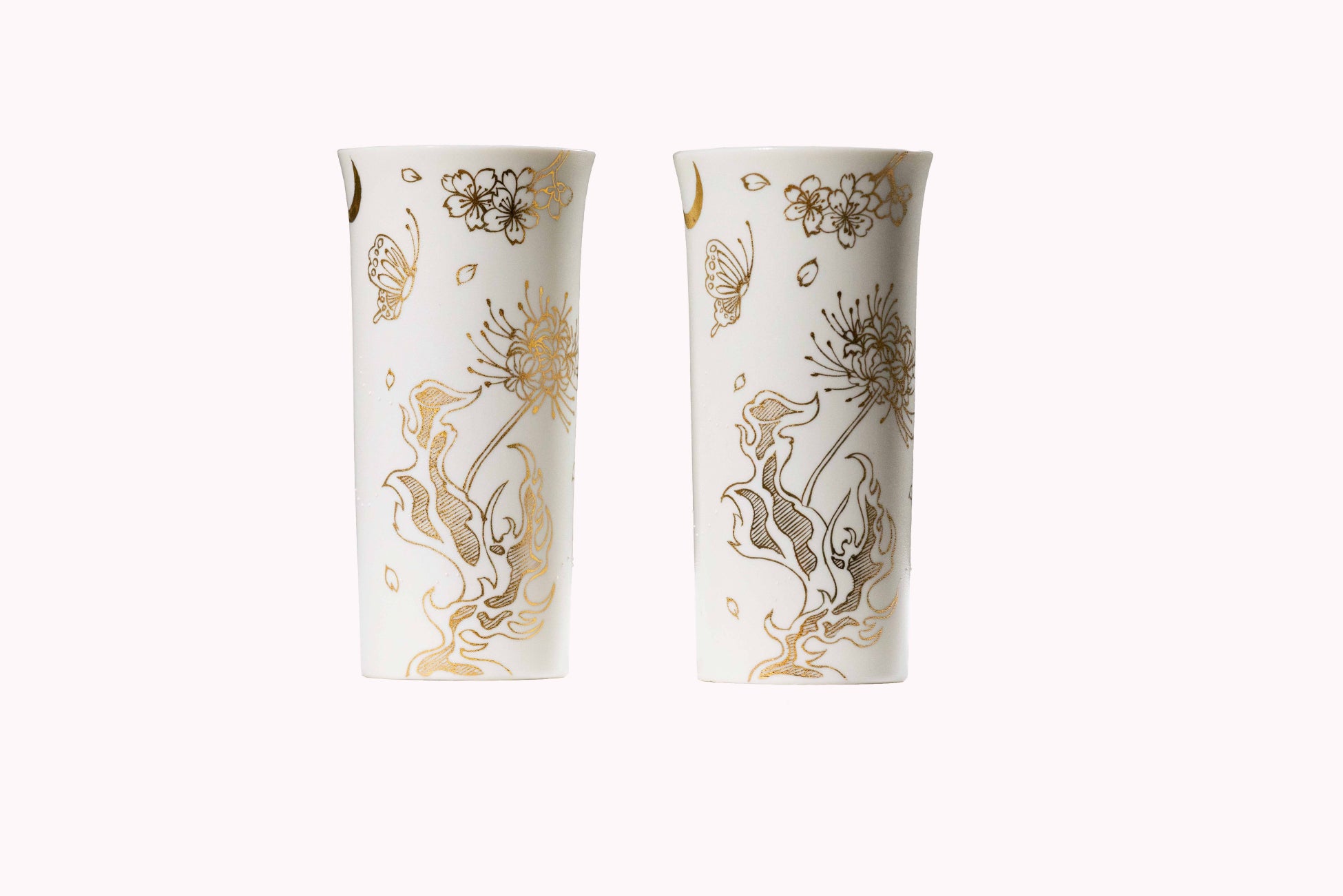 展覧会キービジュアルから5つのモチーフ(炎、蝶、桜、月、彼岸花)を白磁にデザインし金彩で描きました。白磁は、熊本の天草で採取した美しい白い土をマットな釉薬で仕上げ、繊細な表現をしています。お酒やジュースなどドリンクはもちろんのこと、一輪挿しとしてもお使いいただけるタンブラーのペアセットです。