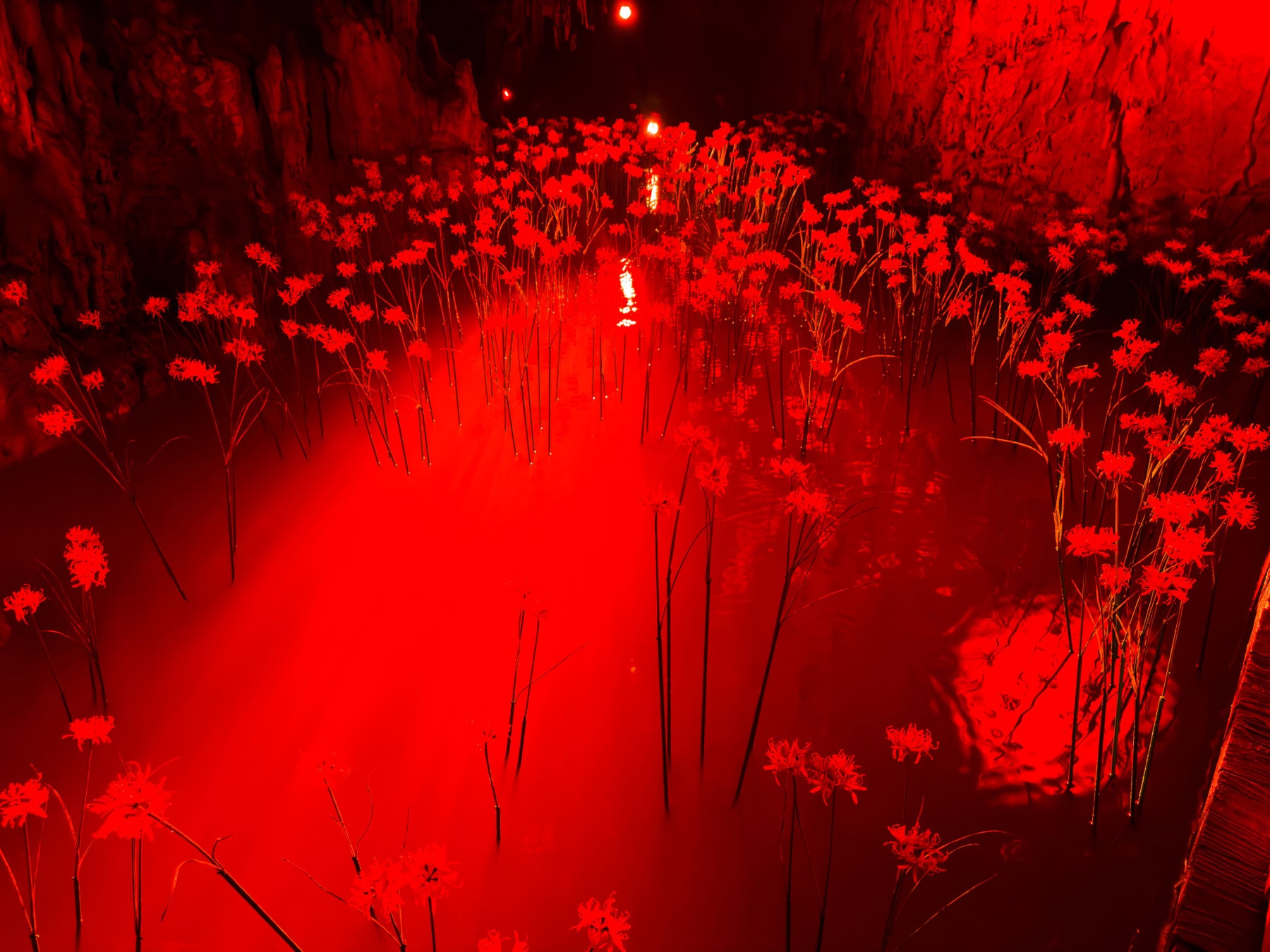 4000本以上の彼岸花が織りなす真っ赤に染まった空間が、鑑賞者を包み込む作品。突如展開される全面真紅の空間は、色彩の劇的な変化により、異界に入ったことを認識します。彼岸の象徴である花々と共鳴し、鑑賞者に多様な感覚を呼び起こします。