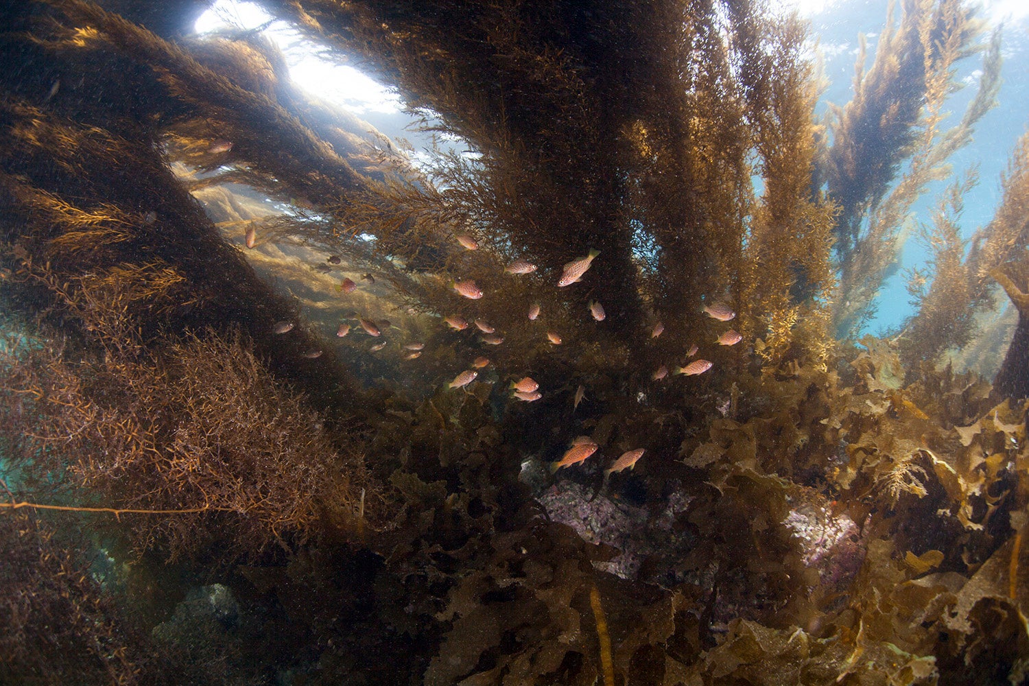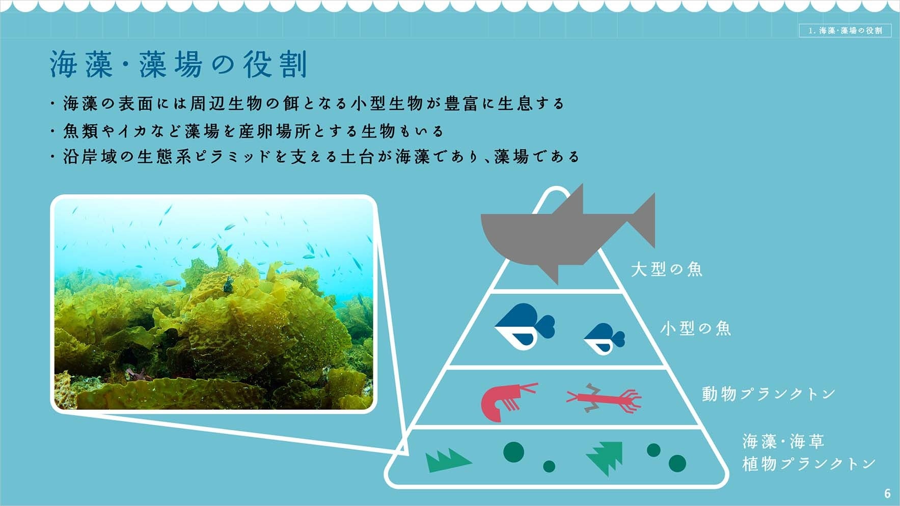 海藻を含む藻場は海洋生態系において極めて重要な役割を果たしています。その主な機能として、水質浄化や光合成による酸素の供給、生物多様性の維持、さらには二酸化炭素を吸収して炭素を固定するなどがあります。藻場は、海洋生態系の基盤として小魚や動物プランクトンなどの餌を供給し、最終的には大型魚を支える存在です。