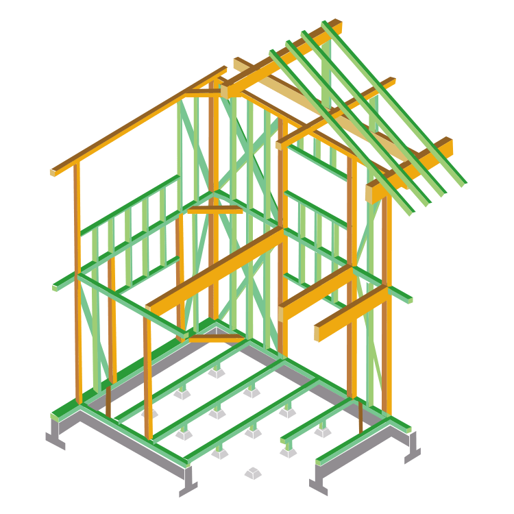 小屋束、垂木、土台、大引、床束、間柱、筋違、筋違たすき掛け、窓台、けたに利用できます。