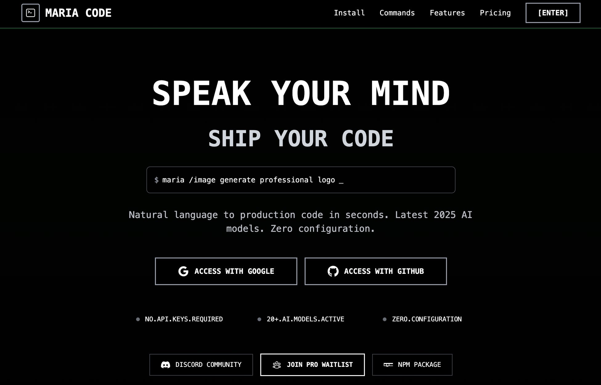 APIキー不要・ゼロ構成、`npm i -g @bonginkan/maria`でセットアップが完了します。