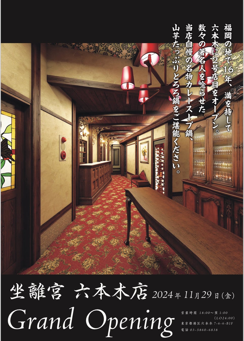 【東京初出店!】福岡発の大人の隠れ家『坐離宮(ざりきゅう)』が創業16年目にして、遂に2024年11月29日(金)、東京・六本木に2号店をグランドオープン!
