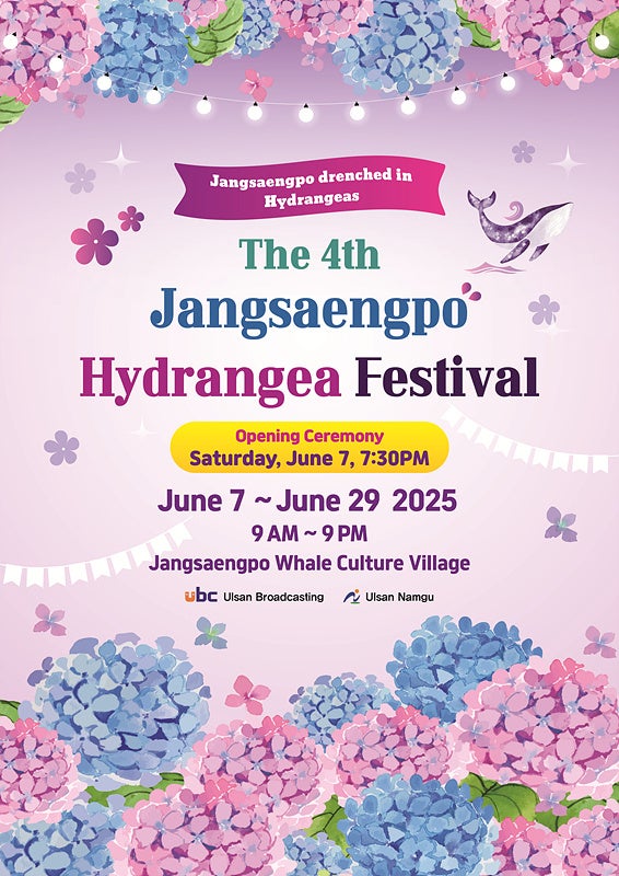 蔚山広域市南区では、2025年6月7日(土)から29日(日)まで計23日間、チャンセンポ・クジラ文化村一帯で「チャンセンポ、あじさいにひたる」をテーマとした「第4回チャンセンポ あじさいフェスティバル」を開催します。約10万2,705㎡の大規模テーマパーク内にある「五色あじさい庭園」(2万7,000㎡)には、40種類以上・3万株のあじさいが咲き誇り、初夏の海辺を華やかに彩ります。