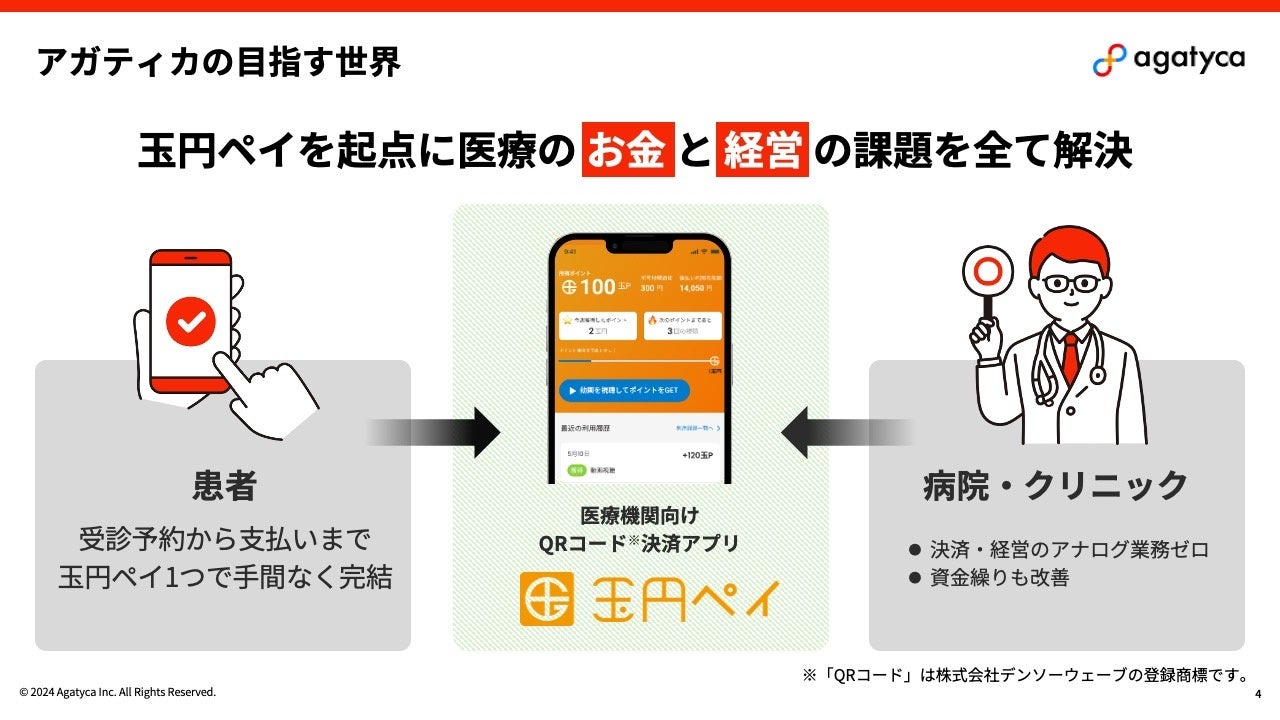 アガティカは玉円ペイを起点として、医療のお金と経営の課題をキャッシュレス化・DX化により解決し、持続可能な医療の実現へ貢献していきます。