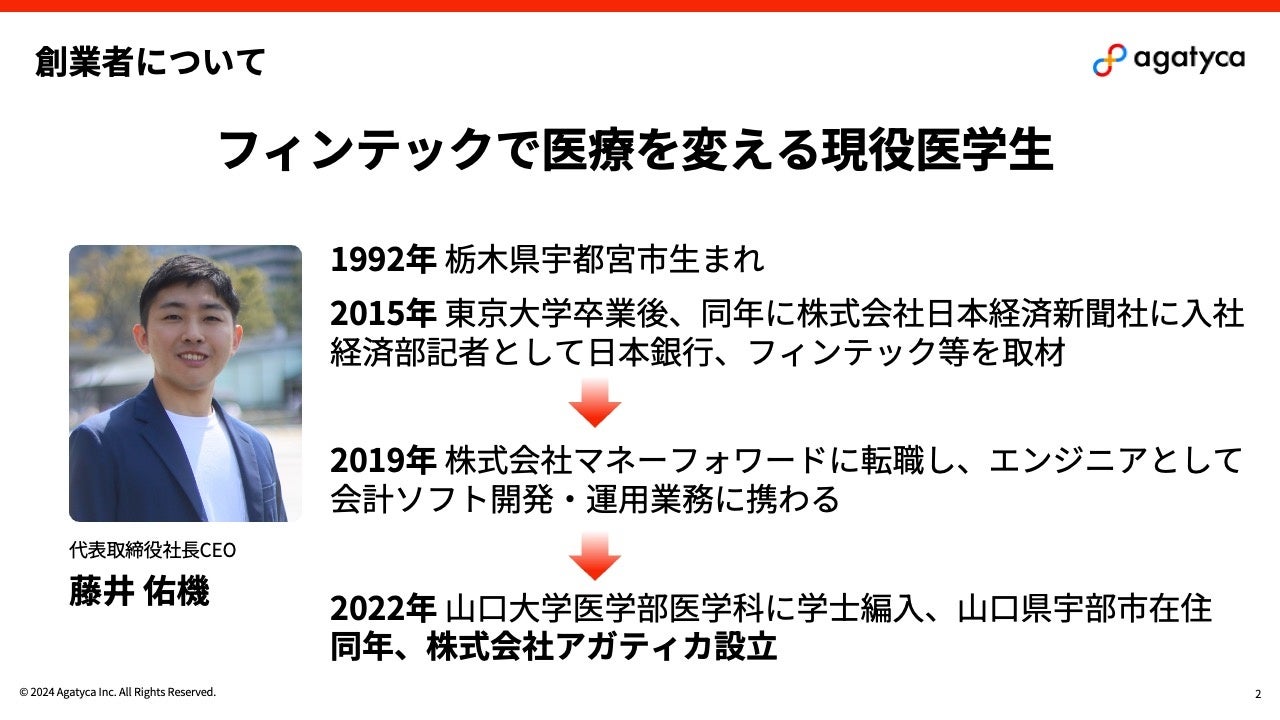 アガティカ創業者で代表取締役社長CEOの藤井佑機は、元々は東京大学卒業後に株式会社日本経済新聞社で経済記者として日本銀行の金融政策や金融市場、フィンテック企業、経済産業省のキャッシュレス政策やIT政策を取材しておりました。その後株式会社マネーフォワードでエンジニアとして会計ソフトの開発・運用に携わり、2022年に山口大学医学部医学科に学士編入しました。