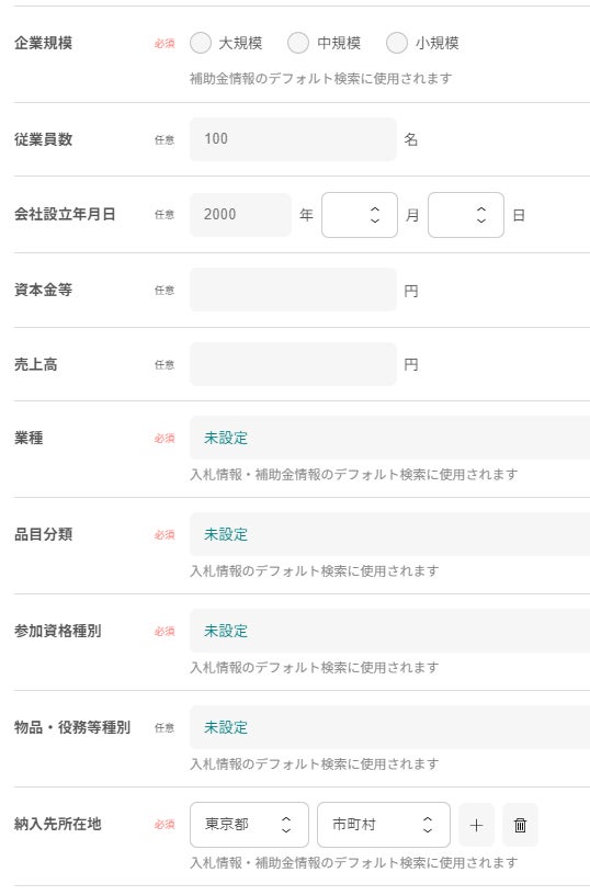 企業規模、業種、取扱品目、参加資格などの企業情報にマッチする入札・補助金情報の抽出。