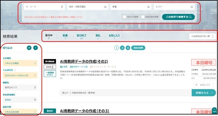 絞り込み検索は「公示種別」「締切日」「組織」など様々な視点で適切な絞り込みが可能。