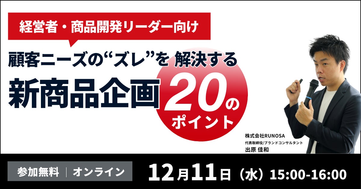 ブランドコンサルティング事業を展開する株式会社RUNOSA(本社:東京都渋谷区、代表取締役:出原佳和)は、2024年12月11日(水)15:00〜16:00に「顧客ニーズの“ズレ”を解決する新商品企画のポイント20」セミナーをオンラインで開催します。本セミナーの講師を務める出原は、かつてUNIQLOで数々のヒット商品に携わり、現在は製造業や小売業において、企業が新たなステージに挑戦するため戦略から実行まで一貫した支援を提供しているコンサルタントです。セミナーでは、これまでの実績をもとに、現代の市場で「本当に求められる商品」を生み出すための実践的なアプローチを具体例を交えながら紹介します。